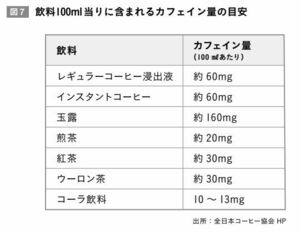 そのため眠気覚ましや集中力アップに使われることが多いようです。カフェインの覚醒作用は3―5時間ほど持続しますが、とり続けていると耐性ができてしまい、量や頻度が増えてしまう事があります。WHOのカフェインの1日の摂取量の基準は300ミリグラムで、製品によって含有量は異なるものの、栄養ドリンクなら6本程度、エナジードリンクなら2-3本程度になります。
