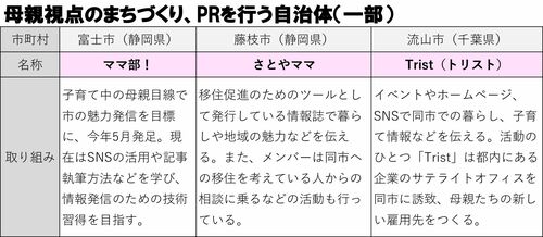 千葉県流山市では、13年前から共働きの子育て世代を定住させたいと、取り組みを開始している。2010年、首都圏の交通機関に掲出されたポスターのキャッチコピーは「母になるなら、流山市。」インパクトも手伝い、人口は10年前より約2万5千人増、子育て世代も増えている。