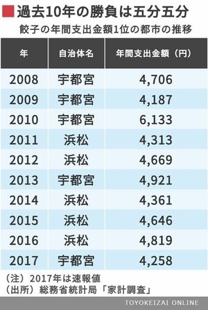 餃子の街として知られる、静岡県浜松市と栃木県宇都宮市。この2都市が毎年、餃子の消費量を巡り火花を散らしているのは有名だ。この「餃子戦争」は2007年、「浜松餃子学会」が記者会見を開いたことに始まる。浜松市とおこなった独自調査を根拠に、「餃子消費量日本一宣言」をしたのだ。