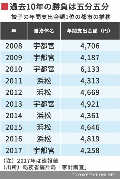 2018年1月末に最新の「家計調査」が発表され、2017年は宇都宮市が4年ぶりに日本一を奪還した。過去10年間の戦績を振り返ると、結果は以下のようになった。