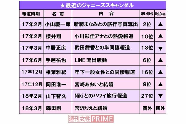 テレビ朝日の小川彩佳アナウンサーとの熱愛が報じられた櫻井翔だが、昨年は“嫌い”11位だったため、わずかに1つしか順位を上げていない。