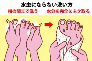 皮膚が傷つくと水虫菌が侵入しやすくなるので、洗うときに足の皮膚を強くこすりすぎるのは避け、靴ずれにも注意してください。
