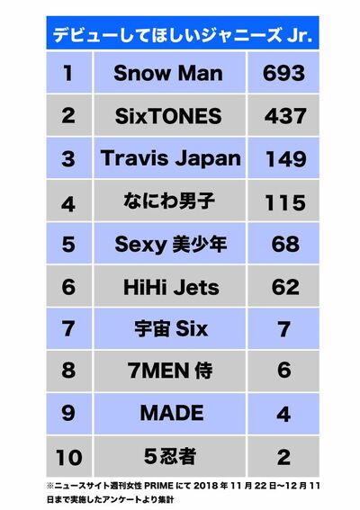 ジャニーズ 2018/12/31 <デビューしてほしいJr.2018>ファンから「報われてほしい」と願われるNo.1グループは? ジャニーズJr.ランキングSnow Man7MEN侍 印刷 デビューしてほしいジャニーズJr.2018/週刊女性PRIME記事内の画像をクリックすると、昨年のランキングが表示されます! すべての写真を見る facebook いいね X ポスト LINE はてなブックマークに追加 ジャニーズJr.の記事一覧を見る タレコミを投稿する 今日の運勢を無料で見る コピーしました