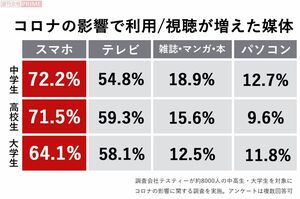 中学生・高校生・大学生に“コロナの影響で利用・視聴が増えた媒体は?”という質問で集計データをとったところ、すべての世代で“スマホ”は1位に。