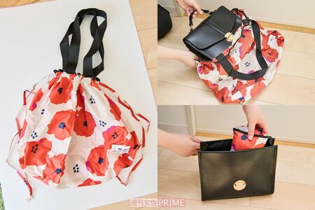 「このレインバッグカバーの特徴は、バッグカバーだけでなくエコバッグとしても使用できるというところです。小さくたためるので、いつものバッグに忍ばせておけばサッと取り出して使えます」