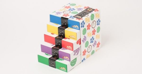 青色で模様が描かれた『大野神社ご神紋柄』は厚切りのココア味。黄色の『宮柄』は厚切りのプレーン。赤色の『桜柄』はしっかりとした焼き目のプレーンで、紫色の『松柄』は薄切りのココア味2枚組。緑色の『葉柄』は薄切りプレーン2枚組。単品だと1箱650円、5段重ねは3200円で50円お得となっている。