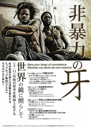 多くの人たちが東京外大に集まっていた。昔からの友人、役者の金子清文君も「非暴力の牙・世界の鏡に照らして」というタイトルのライブ、シンポジウムに参加するためにこの学祭に来ていた。その金子君いわく、「クルギは日本のSEALDsの代表みたいな二人。権力に非暴力で立ち向かおうとヒップホップで伝道する奇妙な好青年なんです」。酒もドラッグもやらないそうで、格好はいかついけど、大真面目。歌はかなりうまい。彼らのいるところ、セネガルの若者が寄ってくる。