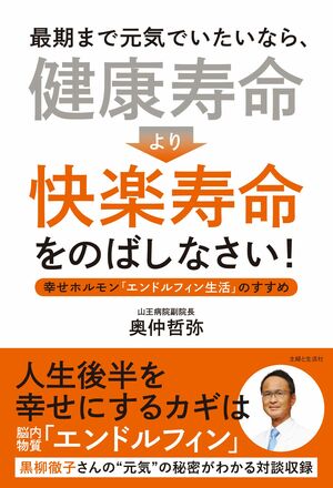 奥仲先生の新刊『最期まで元気でいたいなら、「健康寿命」より「快楽寿命」をのばしなさい』(定価1404円)は人生後半を幸せに自分らしく生きるノウハウが満載。エンドルフィンを放出する詳しいポイントや、黒柳さんを代表に、高齢者の方々の人生を楽しむノウハウが紹介されています。