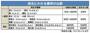 例えば、お葬式にかかる費用(お経・戒名・お布施)は平均で44万6000円(日本消費者協会「第10回『葬儀についてのアンケート調査』報告書」/2014年)だが、簡単にやろうとすると16万円ぐらいでもできる。戒名料にしても表のように金額のケタが違ってくる。