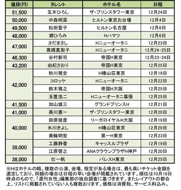 芸能 2016/10/28 有名人の年末ディナーショーのチケット料金ランキング2016、最高額はやっぱりアノ人! 松田聖子郷ひろみ中森明菜酒井法子紅白歌合戦工藤静香氷川きよし 『週刊女性』編集部 印刷 続いて、1〜20位! ランキング表1~20位 すべての写真を見る facebook いいね X ポスト LINE はてなブックマークに追加 アーティストの記事一覧を見る タレコミを投稿する 今日の運勢を無料で見る コピーしました