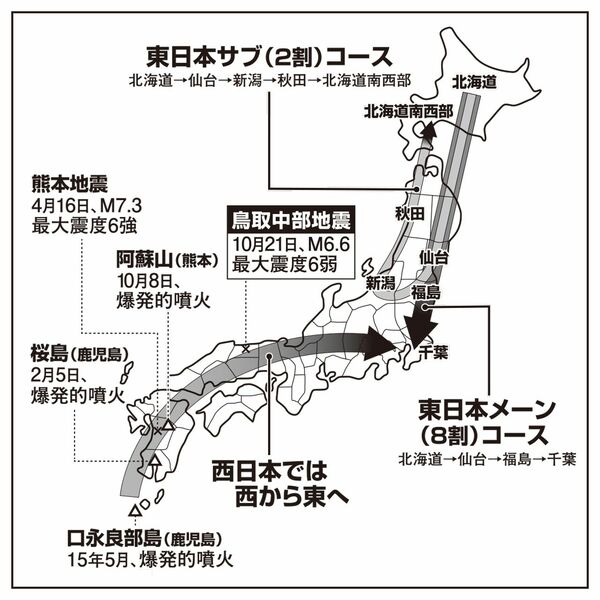次はどこで大地震・大噴火が起きるのか。ここ約1年半を振り返ると、口永良部島噴火→桜島噴火→熊本地震→阿蘇山噴火→鳥取県中部地震と、九州南端から徐々に東に向かうように異変が続いている。西から東へ─。そんな法則があるのだろうか。