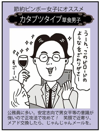このタイプの草食男子は、人付き合いがヘタな人が多く、明るくてコミュ力のある女性を好みます。会話にジョークを折り混ぜつつほめちぎりましょう。面白味がなくても、夫にできたらボンビー女子には安定した生活が待っています。貯蓄型なので老後も安泰。