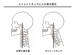人間の背骨は、横から見ると前へカーブしている部分と後ろへカーブしている部分が拮抗したバランスで頭部を支えています。これがスマホを見る姿勢が固定化されることにより、顔の位置が正常よりも前に出てしまい(猫背状態が固定化)、正常なカーブがストレートになるというわけです。
