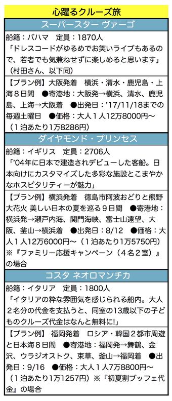 ライフ 2017/7/29 まだ間に合う!お得な夏旅プラン「1泊1万円台で豪華クルーズ、バリ片道3万円LCCなど」 旅行 『週刊女性』編集部 印刷 [写真 1/19枚目] この夏はクルーズ旅がアツい? 写真はコスタ ネオロマンチカ [写真 2/19枚目] 旅好き55人に本音アンケート [写真 3/19枚目] 最高3つまで回答可。「その他」の詳細は、「ペット同伴の可否」(40代男性)、「子どもが楽しめるか」(40代女性)、「混雑状況。素敵なリゾート地であっても極端に混みそうなタイミングは避ける」(40代男性)など [写真 4/19枚目] [写真 5/19枚目] [写真 6/19枚目] 四国まんなか千年ものがたり(写真提供:JR四国) [写真 7/19枚目] のと里山里海号(写真提供:のと鉄道) [写真 8/19枚目] リゾート21「KINME Train」(写真提供:伊豆急行) [写真 9/19枚目] ダイヤモンド・プリンセスの船内(写真提供/ダイヤモンド・プリンセス) [写真 10/19枚目] 今夏日本初入港のスーパースター ヴァーゴは13階建て、広さは東京ドームの1.5倍! 撮影/渡邉智裕 [写真 11/19枚目] スーパースター ヴァーゴの船内(1)エントランスから異空間 撮影/渡邉智裕 [写真 12/19枚目] スーパースター ヴァーゴの船内(2)ジュニア・スイートのお部屋。ベッドはキングサイズ 撮影/渡邉智裕 [写真 13/19枚目] スーパースター ヴァーゴの船内(3)ジュニア・スイートのお部屋。バスルームがオーシャンビュー 撮影/渡邉智裕 [写真 14/19枚目] スーパースター ヴァーゴの船内(4)高級ラウンジみたいな図書館。他にも宿泊客は無料で利用できる施設が多数 撮影/渡邉智裕 [写真 15/19枚目] スーパースター ヴァーゴの船内(5)フィットネスジムも無料 撮影/渡邉智裕 [写真 16/19枚目] スーパースター ヴァーゴの船内(6)よしもと所属の芸人が毎回乗船、生ライブを堪能できる 撮影/渡邉智裕 [写真 17/19枚目] スーパースター ヴァーゴの船内(7)1日最大6食まで3つのレストランで食事し放題。有料のレストランやバーも多数完備。 撮影/渡邉智裕 [写真 18/19枚目] スーパースター ヴァーゴと横浜の夜景 撮影/渡邉智裕 [写真 19/19枚目] ウォータースライダーもあるプールは朝から晩まで泳ぎ放題 撮影/渡邉智裕 この写真の記事へ戻る