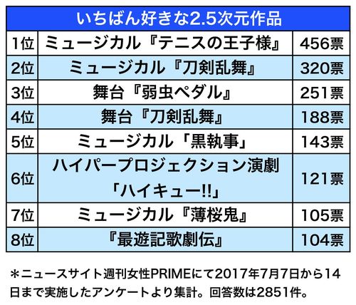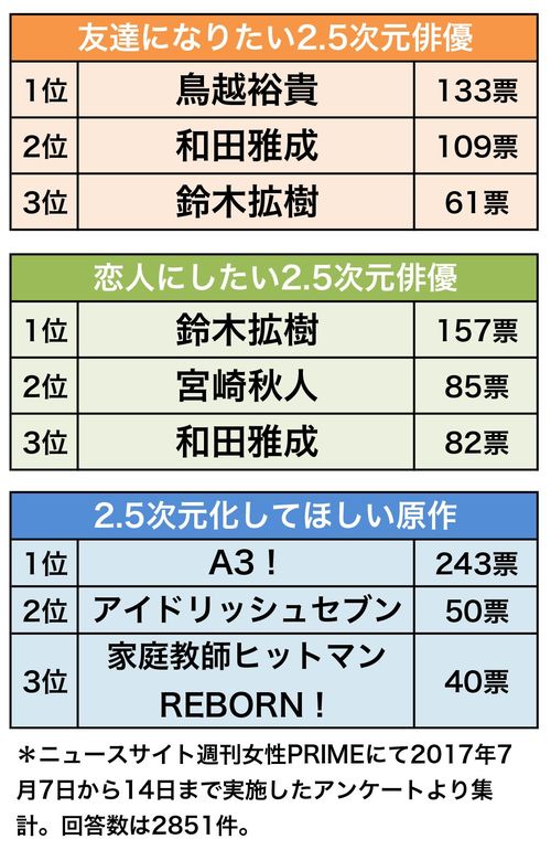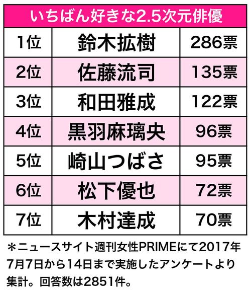 芸能 2017/8/17 好きな2.5次元俳優、週女的「神7」を発表! 本人コメントも一挙紹介 2.5次元ランキングアンケート 『週刊女性』編集部 印刷 [写真 1/11枚目] 週刊女性PRIMEで行ったアンケートをもとに、2.5次元俳優の「神7」を発表! [写真 2/11枚目] 鈴木拡樹 [写真 3/11枚目] 佐藤流司 [写真 4/11枚目] 和田雅成 [写真 5/11枚目] 黒羽麻璃央 [写真 6/11枚目] 崎山つばさ [写真 7/11枚目] 松下優也 [写真 8/11枚目] 木村達成 [写真 9/11枚目] [写真 10/11枚目] [写真 11/11枚目] この写真の記事へ戻る