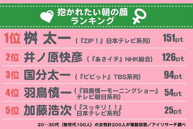 ライフ 2017/9/11 「抱かれたい朝の顔」ランキング2017年版! 1位はあのイケメン局アナ セキララアナリティクス恋愛・結婚 雛菊あんじ(セキララアナリティクス調査員) 印刷 [写真 1/4枚目] 午前7〜8時代に放送している、主な全国ネット各局の情報/バラエティ番組のメインキャスターから選出。それぞれ1位3pt、2位2pt、3位1ptで算出 [写真 2/4枚目] 日本テレビ公式サイト(アナウンサープロフィール)より [写真 3/4枚目] 『アド街』新司会・井ノ原快彦起用に、薬丸裕英が安心の訳 [写真 4/4枚目] 加藤浩次 この写真の記事へ戻る