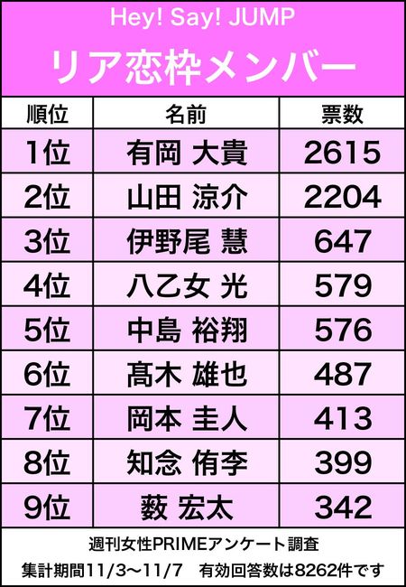 ジャニーズ 2017/12/13 <8000人アンケート>Hey! Say! JUMPで最も支持された“リア恋枠”メンバーは? 山田涼介有岡大貴アンケートランキングHey! Say! JUMP 印刷 [写真 1/2枚目] [写真 2/2枚目] この写真の記事へ戻る