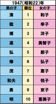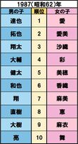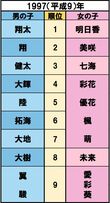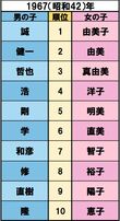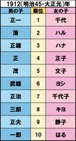 トレンド 2018/11/16 明治時代からどど〜んと振り返る、日本の “人気ネーム” 変遷がおもしろすぎる! 歴史 『週刊女性』編集部 印刷 [写真 1/12枚目] ※写真はイメージです [写真 2/12枚目] 明治天皇が崩御、孫文が中華民国の成立を宣言、ストックホルムオリンピックに日本初参加【誕生】双葉山定次、檀一雄 出典/明治安田生命 [写真 3/12枚目] 健康保険法公布、伊・ムッソリーニが首相就任、ソビエト連邦成立【誕生】水木しげる、瀬戸内寂聴 出典/明治安田生命 [写真 4/12枚目] 満州国が建国宣言、五・一五事件で犬養毅首相が殺害される【誕生】青島幸男、田中邦衛、石原慎太郎 出典/明治安田生命 [写真 5/12枚目] ミッドウェイ海戦、全国中等学校優勝野球大会が中止に【誕生】小泉純一郎、中尾彬、近藤正臣 出典/明治安田生命 [写真 6/12枚目] 日本国憲法施行、学校給食開始、カスリーン台風、古橋廣之進が水泳で世界新記録【誕生】ビートたけし、高田純次、岸部一徳 出典/明治安田生命 [写真 7/12枚目] 岸信介内閣が成立、南極に昭和基地、諫早豪雨、ソ連・スプートニク号の打ち上げに成功【誕生】名取裕子、大竹しのぶ、夏目雅子 出典/明治安田生命 [写真 8/12枚目] ツイッギーが来日しミニスカブーム、東京キー局がカラーテレビ本放送開始、四日市公害訴訟【誕生】織田裕二、天海祐希、坂上忍 出典/明治安田生命 [写真 9/12枚目] 国鉄民営化、安田生命がゴッホ『ひまわり』53億円で購入、石原裕次郎死去、マイケル・ジャクソン初来日【誕生】長澤まさみ、井上真央 出典/明治安田生命 [写真 10/12枚目] 消費税率5%に、香港がイギリスより返還【誕生】芳根京子、杉咲花 出典/明治安田生命 [写真 11/12枚目] 新潟県中越沖地震、宮崎県知事に東国原英夫、第1回東京マラソン、石川遼がメジャー世界最年少優勝【誕生】加藤憲史郎、本田紗来 出典/明治安田生命 [写真 12/12枚目] 九州北部豪雨、トランプ米大統領が就任、藤井聡太四段(現七段)が29連勝【誕生】上野動物園のシャンシャン 出典/明治安田生命 この写真の記事へ戻る