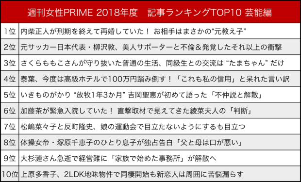 芸能 2018/12/29 『週刊女性PRIME』2018年・芸能記事ランキングTOP10 ランキング 週刊女性PRIME 印刷 [写真 1/7枚目] 2018年記事ランキング(芸能編) [写真 2/7枚目] 内柴正人 [写真 3/7枚目] 14年限りで現役を引退、現在は古巣の鹿島でコーチを務める柳沢 [写真 4/7枚目] ちびまる子ちゃんランド内の献花台には連日多くの人が訪れている [写真 5/7枚目] 泰葉 [写真 6/7枚目] 突然の直撃取材にも、立ち止まって笑顔を見せながら質問に答える吉岡 [写真 7/7枚目] この写真の記事へ戻る