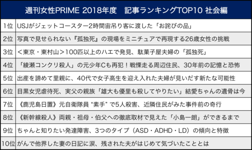 社会・事件 2018/12/27 『週刊女性PRIME』2018年・社会記事ランキングTOP10 孤独死 週刊女性PRIME 印刷 [写真 1/7枚目] 2018年記事ランキング(社会編) [写真 2/7枚目] 大阪にあるユニバーサル・スタジオ・ジャパン [写真 3/7枚目] 「最近は“第一発見者になりたくない”“事情聴取がめんどくさい”という理由で、なんとなく異変に気づいても通報しない人が増えています」。この現場も亡くなってから発見までに時間がかかったため、布団に広がった体液の色は、茶色くどす黒い 撮影/齋藤周造 [写真 4/7枚目] 遺体が見つかった住居兼店舗。雑収入目的か与野党4政党の議員のポスターや自販機も [写真 5/7枚目] 事件現場。容疑者は写真右スペースでUターンする車を威嚇していた [写真 6/7枚目] ※写真はイメージです [写真 7/7枚目] この写真の記事へ戻る