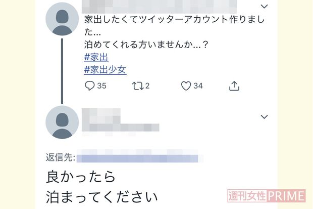 社会・事件 2019/12/5 「#家出少女」に群がる下心丸出しの『泊め男』、心を許してしまう少女の本音 事件誘拐SNSTwitter容疑者 『週刊女性』編集部 印刷 [写真 1/3枚目] SNS上での家出少女の投稿とそれに返信する『泊め男』。匿名なため年齢、性別、住まいなどは一切不明 [写真 2/3枚目] フジテレビの新生放送バラエティ『超調査チューズデイ~気になる答え今夜出します~』(公式サイトより) [写真 3/3枚目] SNS上での家出少女の投稿とそれに返信する『泊め男』。匿名なため年齢、性別、住まいなどは一切不明 この写真の記事へ戻る