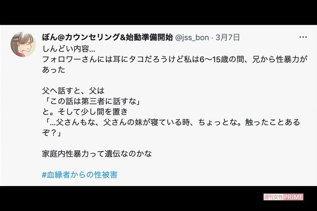 社会・事件 2021/7/16 「兄からの性暴力」を受けた妹の悲痛な叫び、何十年も被害者を苦しめる“深い傷” 家族性暴力兄弟 大塚玲子(ノンフィクションライター) 印刷 [写真 1/3枚目] 筆者の元に寄せられた、性暴力を訴える声 [写真 2/3枚目] 筆者の元に寄せられた、性暴力を訴える声 [写真 3/3枚目] 大塚玲子著『ルポ 定形外家族 わたしの家は「ふつう」じゃない』 この写真の記事へ戻る