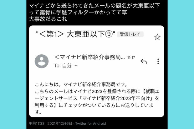 ライフ 2021/12/8 マイナビ炎上中の“学歴フィルター”疑惑、現役人事担当者が明かした裏側「あるのは当たり前」 ビジネス就職転職大学 印刷 [写真 1/2枚目] 拡散されたツイート(Twitterより) [写真 2/2枚目] 12月6日19時ごろに学歴フィルターを否定するとともに、誤送であったとことを謝罪したマイナビからのメール この写真の記事へ戻る