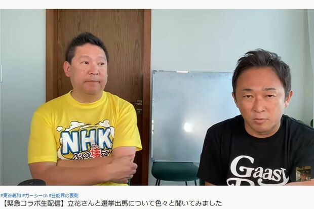 芸能 2022/6/24 ガーシー、立花孝志氏のNHK党・比例区出馬で議員バッジをつける現実味 政治評論家の見解は 選挙NHKガーシーYouTube立花孝志 印刷 [写真 1/9枚目] ガーシーこと東谷氏(写真右)。5月25日には比例代表として参院選出馬を表明(東谷氏のチャンネルより) [写真 2/9枚目] ガーシーがYouTubeにアップしたマイファスHiroと交際相手だったA子さん(プライバシー保護のため一部を編集部で加工) [写真 3/9枚目] 泥酔しているような女性を抱える小栗旬(東谷義和氏のTwitterより) [写真 4/9枚目] 両脇に女性に囲まれてダブルピースをする小栗旬(東谷義和氏のTwitterより) [写真 5/9枚目] ガーシーが YouTubeにアップしたマイファスHiroと交際相手だったA子さん(プライバシー保護のため一部を編集部で加工) [写真 6/9枚目] ガーシーが YouTubeにアップしたマイファスHiroとA子さんの中絶トラブルの証明画像(プライバシー保護のため一部を編集部で加工) [写真 7/9枚目] Hiroと緊急対談を行ったガーシー(東谷氏のYouTubeチャンネルより) [写真 8/9枚目] 5月12日、高岡蒼佑に《ぜひコラボしたいな》とラブコールを送った“ガーシー”こと東谷義和氏(公式ツイッターより) [写真 9/9枚目] 街を走るガーシーの選挙カー(浜田聡参議院議員のツイッターより) この写真の記事へ戻る