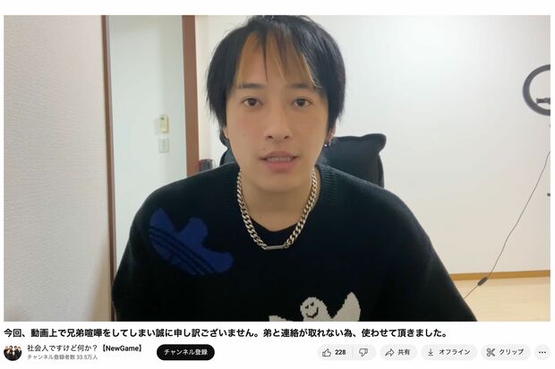 芸能 2023/3/16 「家賃未納で不法占拠に…」総フォロワー200万人超えの双子TikTokerが経営トラブルで「絶縁」宗教や集金の“撃退動画”で人気獲得も、知人が語る“兄弟ゲンカ”の真相 YouTube家族YouTuber兄弟トラブル炎上 印刷 [写真 1/15枚目] 2023年3月7日、《弟と連絡が取れない》という動画を投稿した『社会人ですけど何か?』のリー氏(YouTubeより)https://www.youtube.com/watch?v=AO7AQ3NRGlc&t=32s [写真 2/15枚目] 人気インフルエンサーグループ『社会人ですけど何か?』の公式TikTokはフォロワー数170万人(TikTokより)https://www.tiktok.com/@syakanani.riisan [写真 3/15枚目] 『社会人ですけど何か?』のYouTubeチャンネルには、兄弟の“ケンカ動画”が並ぶ(YouTubeより)https://www.youtube.com/@newgame8966/videos [写真 4/15枚目] [写真 5/15枚目] 人気インフルエンサーグループ『社会人ですけど何か?』左は兄のリー氏、右が弟のルー氏(ルー氏のインスタグラムより) https://www.instagram.com/p/Cfs4WtiLjor/ [写真 6/15枚目] 2023年2月上旬に『社会人ですけど何か?』のリー氏がアップした動画(現在は削除済み) [写真 7/15枚目] 2023年2月20日、《弟と絶縁しました》という動画を投稿した『社会人ですけど何か?』のリー氏(YouTubeより)https://www.youtube.com/watch?v=eqSVqH8EF2I&t=1s [写真 8/15枚目] 2023年3月1日、《仲直りする気はない》という動画を投稿した『社会人ですが何か?』のルー氏(YouTubeより)https://www.youtube.com/watch?v=bv1l_IO2S5I&t=53s [写真 9/15枚目] [写真 10/15枚目] 人気インフルエンサーグループ『社会人ですが何か?』左は兄のリー氏、右が弟のルー氏(ルー氏のインスタグラムより) [写真 11/15枚目] 宗教勧誘や集金業者などを“撃退”する動画で人気のインフルエンサーグループ『社会人ですけど何か?』(YouTubeチャンネルより) [写真 12/15枚目] 宗教勧誘や集金業者などを“撃退”する動画で人気のインフルエンサーグループ『社会人ですけど何か?』(YouTubeチャンネルより) [写真 13/15枚目] 宗教勧誘や集金業者などを“撃退”する動画で人気のインフルエンサーグループ『社会人ですけど何か?』(YouTubeチャンネルより) [写真 14/15枚目] 宗教勧誘や集金業者などを“撃退”する動画で人気のインフルエンサーグループ『社会人ですけど何か?』(YouTubeチャンネルより) [写真 15/15枚目] 宗教勧誘や集金業者などを“撃退”する動画で人気のインフルエンサーグループ『社会人ですけど何か?』(YouTubeチャンネルより) この写真の記事へ戻る