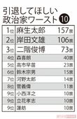 社会・事件 2023/4/21 『引退してほしい政治家ワースト10』と『復活してほしい政治家トップ10』1位は岸田総理より圧勝、毎度おなじみのおぼっちゃま元総理 政治政治家岸田文雄 印刷 [写真 1/13枚目] (左から)高市早苗氏、麻生太郎副総裁、岸田文雄首相 [写真 2/13枚目] ランキングでワースト3となった岸田首相 [写真 3/13枚目] 5位の高市氏は総務省の行政文書問題が影響 [写真 4/13枚目] 「自民党をぶっ壊す」が流行語にもなった小泉氏 [写真 5/13枚目] [写真 6/13枚目] 『引退してほしい政治家ワースト10』※4/9~10に全国の1000人にネット上でアンケートを実施。有効回答600の結果をもとにランキングを作成した。 [写真 7/13枚目] 『復活してほしい政治家トップ10』※4/9~10に全国の1000人にネット上でアンケートを実施。有効回答600の結果をもとにランキングを作成した。 [写真 8/13枚目] 回顧録が話題を集める安倍氏 [写真 9/13枚目] 「復活してほしい政治家」には田中真紀子氏 [写真 10/13枚目] [写真 11/13枚目] 9位の蓮舫氏には「批判ばかり」との声が多かった [写真 12/13枚目] 引退から8年を経てなお橋下徹氏には復帰を望む声が [写真 13/13枚目] 麻生・自民党副総裁 この写真の記事へ戻る