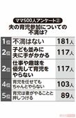 ライフ 2023/6/26 “パパの育児参加”についてママ500人にアンケート!「不満はない」という声が多数の一方で「子ども並みに手がかかる」、変わってきた家事育児の価値観 家族育児ママパパイクメン子育て 印刷 [写真 1/7枚目] ※画像はイメージです [写真 2/7枚目] ※画像はイメージです [写真 3/7枚目] [写真 4/7枚目] ママ500人アンケート(1)夫婦の家事・育児の負担割合は?その他では、妻5:夫5が8%、妻4:夫6が1%、妻が3割以下の人は1%以下という結果に。全体の傾向として妻の負担が多いことがわかる。※全国の子どもがいる20〜40代の女性500人を対象にネットアンケートFreeasyにて5月下旬に実施 [写真 5/7枚目] ママ500人アンケート(2)夫の育児参加についての不満は?6位以下は、妻の育児のやり方にダメ出しをする47人、育児をせず飲みに行ってしまう42人、子どもの前でタバコを吸うなど父親としての自覚が足りない41人などという結果に。※全国の子どもがいる20〜40代の女性500人を対象にネットアンケートFreeasyにて5月下旬に実施 [写真 6/7枚目] 育休を取得し、積極的に育児に励む国山ハセン(本人のSNSより) [写真 7/7枚目] この写真の記事へ戻る