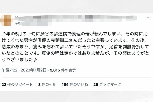 芸能 2023/7/7 「歩道橋で義母を助けてくれた」男性が人気俳優の赤楚衛二だったというツイートがファンの間で話題に 所属事務所からの回答は 男優赤楚衛二ドラマ 印刷 [写真 1/18枚目] 赤楚衛二(21年撮影) [写真 2/18枚目] [写真 3/18枚目] ドラマ『彼女はキレイだった』ロケ中の赤楚衛二と佐久間由衣 [写真 4/18枚目] ドラマ『彼女はキレイだった』ロケ中の赤楚衛二と佐久間由衣 [写真 5/18枚目] ドラマ『彼女はキレイだった』ロケ中の赤楚衛二 [写真 6/18枚目] ドラマ『彼女はキレイだった』ロケ中の赤楚衛二 [写真 7/18枚目] [写真 8/18枚目] 赤楚衛二(21年撮影) [写真 9/18枚目] 1月下旬に行われた、木村拓哉との撮影に参加した赤楚衛二。横顔だけでも端正な顔立ちが際立つ [写真 10/18枚目] 公式インスタグラムでも回復を報告した赤楚。文面からも、彼の人柄のよさが伝わってくる [写真 11/18枚目] 赤楚衛二 [写真 12/18枚目] 赤楚衛二(21年撮影) [写真 13/18枚目] 映画『決戦は日曜日』公開記念イベントに参加した赤楚衛二 [写真 14/18枚目] 映画『決戦は日曜日』公開記念イベント [写真 15/18枚目] [写真 16/18枚目] 赤楚衛二 [写真 17/18枚目] 赤楚衛二(21年撮影) [写真 18/18枚目] 映画『決戦は日曜日』完成披露試写会 この写真の記事へ戻る