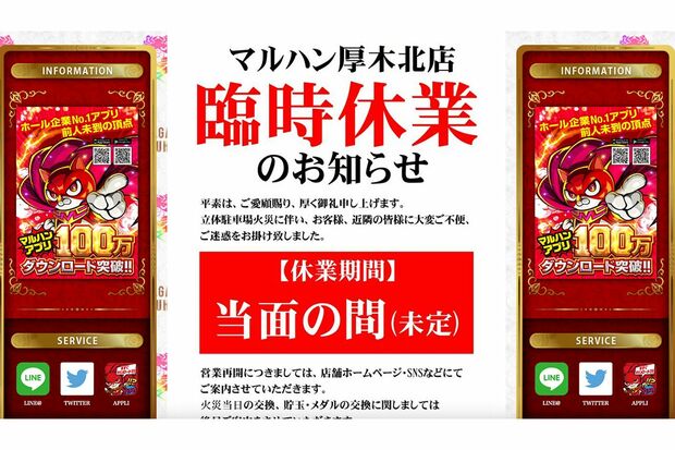 トレンド 2023/8/22 パチンコ店の駐車場が火事で“車100台炎上”…仕事をサボり営業車を燃やした会社員は“なぜか問い合わせ殺到”、パチンコ店との明暗と「放火犯の行方」 SNS放火炎上事件 印刷 [写真 1/5枚目] 火事のあったパチンコ店「マルハン厚木北店」は当面の間臨時休業をすると発表している [写真 2/5枚目] 「車買取レンジャー」社員のツイートは2400万件のインプレッション(8月22日現在) [写真 3/5枚目] [写真 4/5枚目] パチンコ店「マルハン厚木北店」駐車場が大火事に(ツイッターより) [写真 5/5枚目] この写真の記事へ戻る