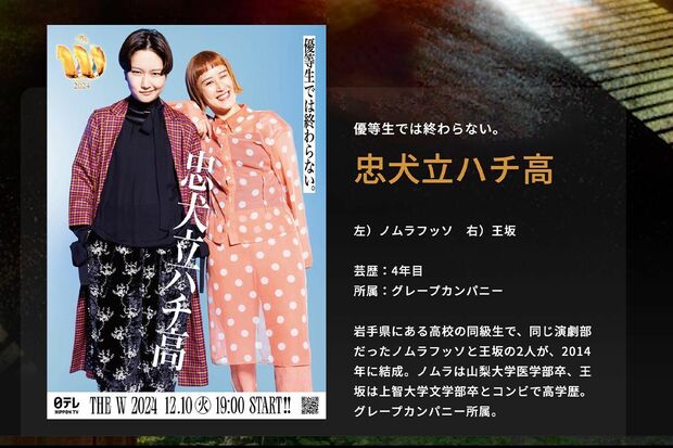 芸能 2024/12/11 『THE W』新女王「にぼしいわし」よりも「忠犬立ハチ高」のほうが“ブレイクが近い”!? 事務所が見出した逸材 サンドウィッチマンカミナリ女芸人お笑い芸人日本テレビ 印刷 [写真 1/11枚目] 忠犬立ハチ高(『THEW』公式サイトより) [写真 2/11枚目] 新女王に輝いたにぼしいわし(『THEW』公式サイトより) [写真 3/11枚目] ブレイク芸人から高橋英樹まで所属するグレープカンパニー(公式サイトより) [写真 4/11枚目] 紺野ぶるま(『THEW』公式サイトより) [写真 5/11枚目] 『サンドウィッチマン』 [写真 6/11枚目] キモ芸人ぶりを見せる“いつもの”永野 [写真 7/11枚目] 「どつき」について上沼から辛口コメントがあったカミナリ [写真 8/11枚目] 「お見送り芸人しんいち」(『R-1グランプリ』HPより) [写真 9/11枚目] ティモンディ(事務所の公式HPより) [写真 10/11枚目] 番組イベントに登場したあぁ~しらき本人(ドッキリGP公式Xより) [写真 11/11枚目] 東京ホテイソン この写真の記事へ戻る