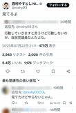 社会・事件 2025/7/24 自民党・西村康稔元経産相が一般ユーザーに「見てろよ」新型コロナ時の“恫喝対応”も再燃してネットで批判続出 自民党政治選挙炎上SNS 印刷 [写真 1/17枚目] 西村康稔元経産相 [写真 2/17枚目] 石破茂(左)と麻生太郎 [写真 3/17枚目] 石破茂首相(左)と太田光 [写真 4/17枚目] 石破茂首相 [写真 5/17枚目] 左から石破茂自民党総裁、田村智子共産党委員長、神谷宗幣参政党代表 [写真 6/17枚目] 死に体となっている石破内閣 [写真 7/17枚目] 西村康稔元経産相のタメ口投稿(本人のXより) [写真 8/17枚目] 西村康稔元経産相(自民党の公式HPより) [写真 9/17枚目] 石破茂首相の妻・佳子夫人(石破首相の公式Xより) [写真 10/17枚目] 海鮮丼の食べ方が汚いと指摘された石破茂首相(『TBS NEWS DIG』公式YouTubeチャンネルより) [写真 11/17枚目] 海鮮丼の食べ方が汚いと指摘された石破茂首相(『TBS NEWS DIG』公式YouTubeチャンネルより) [写真 12/17枚目] “食事マナー”が物議を醸した石破茂首相(たかまつななのYouTubeチャンネル「たかまつななチャンネル」より) [写真 13/17枚目] “食事マナー”が物議を醸した石破茂首相(たかまつななのYouTubeチャンネル「たかまつななチャンネル」より) [写真 14/17枚目] APECの会議場でスマホをいじる石破茂首相(日テレNEWSの公式ホームページより) [写真 15/17枚目] 座ったまま各国首脳と握手を交わす石破茂首相(日テレNEWSの公式ホームページより) [写真 16/17枚目] ネクタイが曲がっている石破茂首相 [写真 17/17枚目] ネクタイが曲がっている石破茂首相 この写真の記事へ戻る