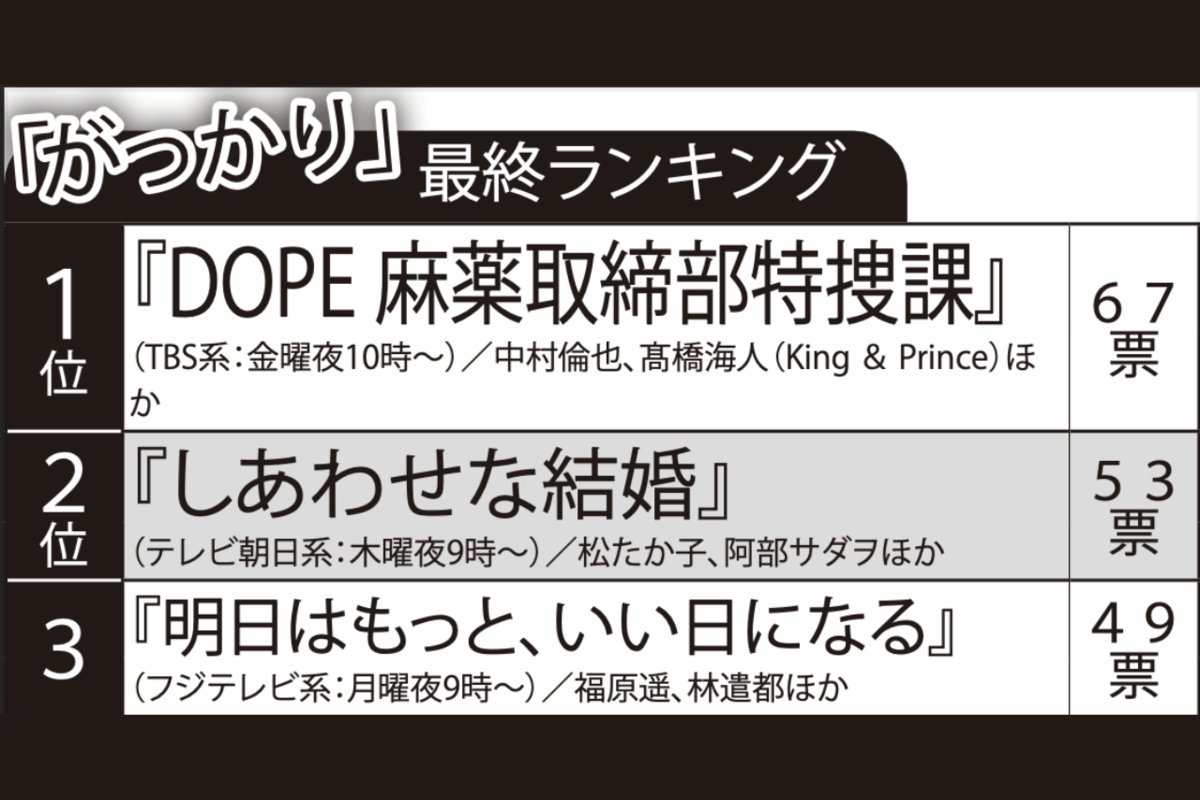 芸能 2025/10/8 《夏ドラマ「がっかり」ランキング》月9史上最低“視聴率”を記録したドラマを抑えた不名誉1位は『DOPE 麻薬取締部特捜課』 ドラマテレビ番組ランキング男優女優 印刷 [写真 1/14枚目] 夏ドラマ「がっかり」ランキングTOP3 [写真 2/14枚目] 福原遥 [写真 3/14枚目] 『しあわせな結婚』出演の松たか子 [写真 4/14枚目] 中村倫也(写真/週刊女性写真班) [写真 5/14枚目] 夏ドラマ「がっかり」ランキング [写真 6/14枚目] ドラマスタート時の「がっかり」ランキング [写真 7/14枚目] 2024年4月上旬、NHKドラマ『Shrink』撮影中の中村倫也と井桁弘恵 [写真 8/14枚目] 2024年4月上旬、NHKドラマ『Shrink』撮影中の中村倫也と井桁弘恵 [写真 9/14枚目] 2024年4月上旬、NHKドラマ『Shrink』撮影中の中村倫也と井桁弘恵 [写真 10/14枚目] 木村拓哉と松たか子が共演した『ラブジェネレーション』 [写真 11/14枚目] 松本白鸚(当時は幸四郎)と、娘の松たか子 [写真 12/14枚目] 2025年6月中旬、駅のホームで痴漢を撃退するシーンを撮り終え、笑顔で現場を離れる福原遥 [写真 13/14枚目] 2025年6月中旬、駅のホームで痴漢を撃退するシーンを撮影中の福原遥 [写真 14/14枚目] 2025年6月中旬、駅のホームで痴漢を撃退するシーンを撮り終え、笑顔で現場を離れる福原遥 この写真の記事へ戻る
