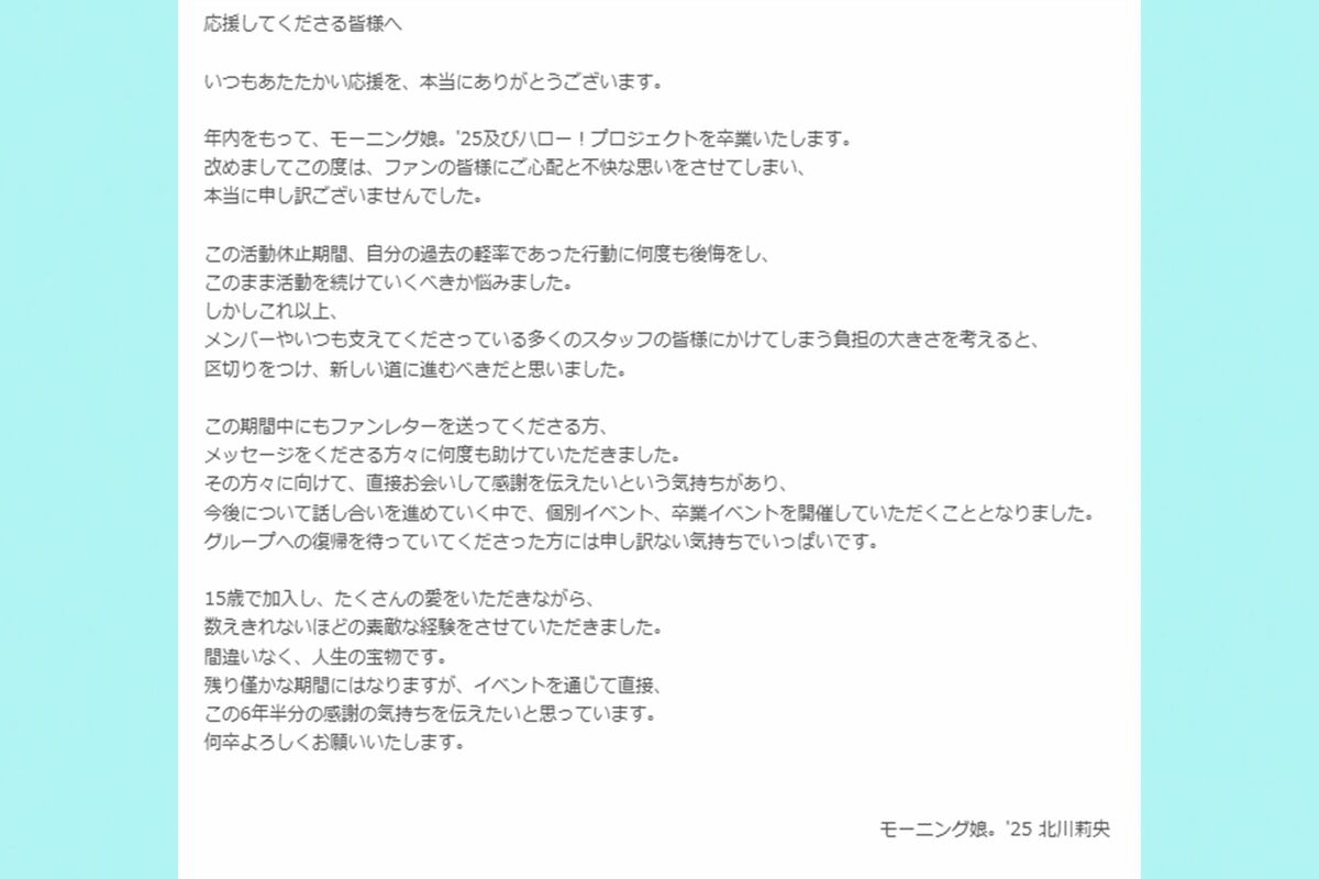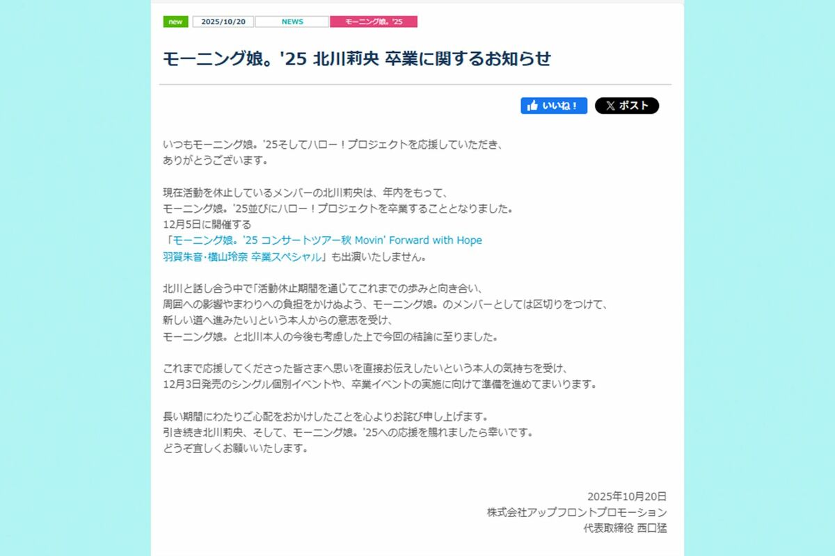 芸能 2025/10/22 モーニング娘。'25・北川莉央にテレビ東京内定報道、思い出される女性アナの悪口音源流出と“卒業”の裏側 モーニング娘。テレビ東京アーティスト女性アイドルアナウンサー卒業 印刷 [写真 1/11枚目] 今年の12月でモーニング娘。'25から卒業することを発表した北川莉央(事務所公式サイトより) [写真 2/11枚目] 以前の面影がないと話題の飯田圭織(本人のインスタグラムより) [写真 3/11枚目] モーニング娘。'25メンバーとの集合写真(北川莉央公式Instagramより) [写真 4/11枚目] 卒業発表について(事務所公式サイトより) [写真 5/11枚目] 北川莉央本人のコメント(事務所公式サイトより) [写真 6/11枚目] モーニング娘。の北川莉央の謝罪文(グループの公式ブログより) [写真 7/11枚目] 2025年9月28日、神奈川県秦野市の「第78回秦野たばこ祭」に参加した元モーニング娘。石黒彩 [写真 8/11枚目] 元モーニング娘。の紺野あさ美と夫で日本ハムファイターズ投手の杉浦稔大(本人のインスタグラムより) [写真 9/11枚目] 以前の面影がないと話題の飯田圭織(本人のインスタグラムより) [写真 10/11枚目] 北川のワンピース(SHEINより) [写真 11/11枚目] モーニング娘。'24(Xより) この写真の記事へ戻る