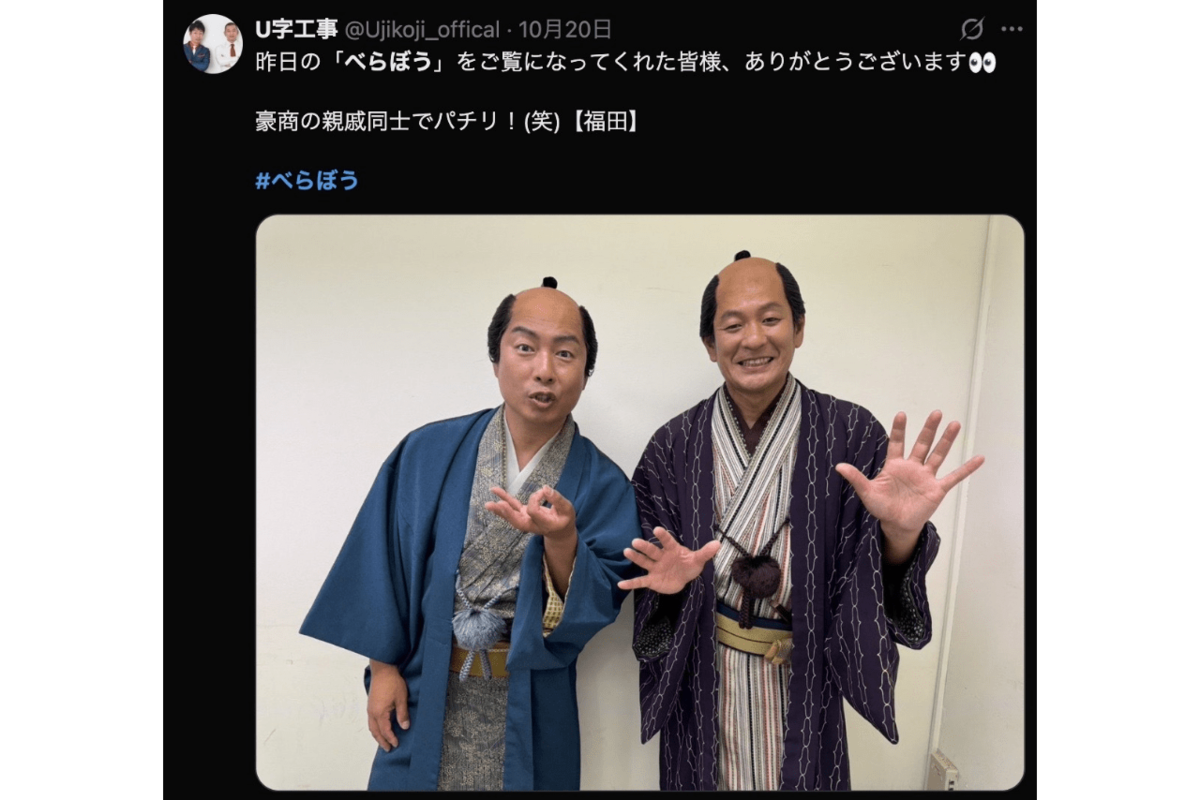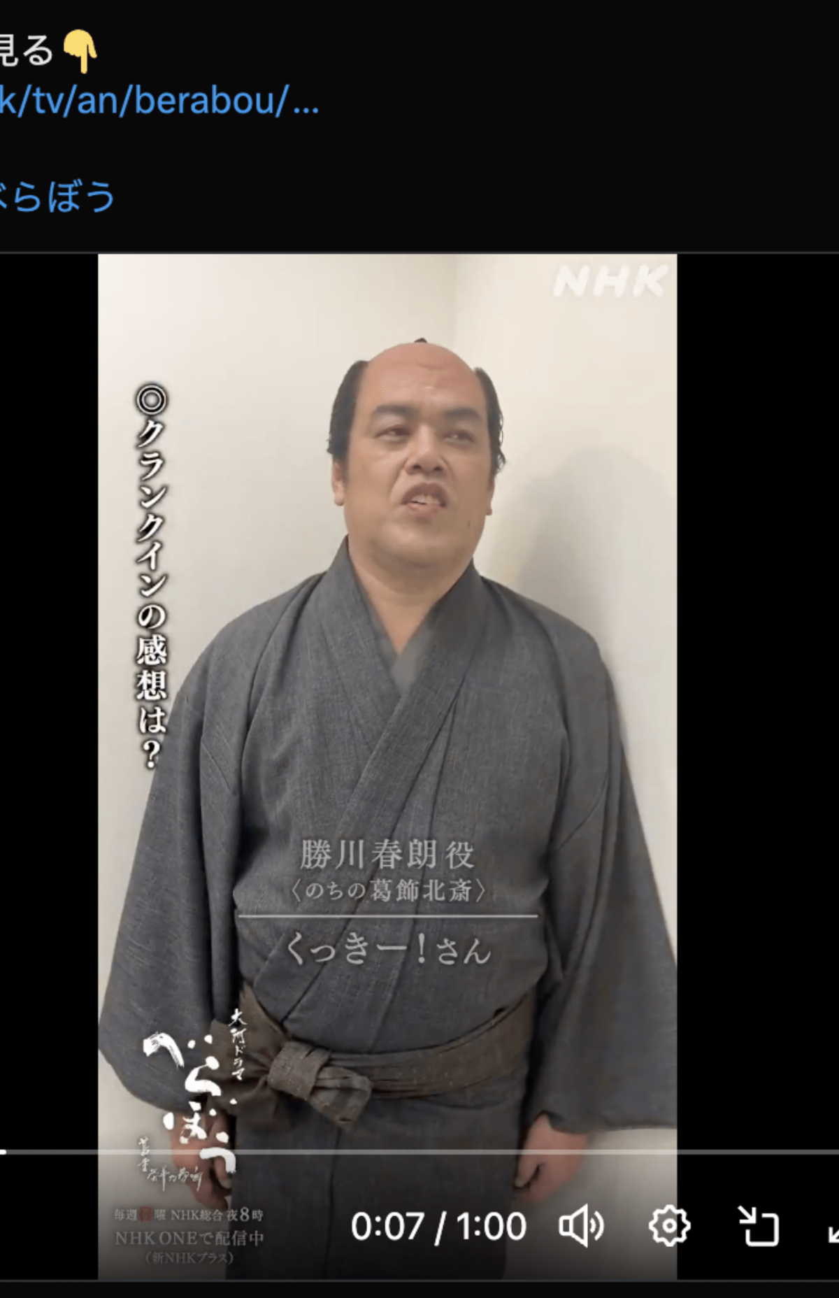 芸能 2025/10/26 NHK大河ドラマ『べらぼう』の巧みな芸人キャスティングが「ハマりすぎ」輝いた葛飾北斎役・くっきー!の“アドリブ” くっきーべらぼう朝ドラ芸人テレビ番組 印刷 [写真 1/13枚目] NHK大河ドラマ『べらぼう』に出演する芸人たち [写真 2/13枚目] 北斎役で出演のくっきー!(公式Xより) [写真 3/13枚目] 北斎役で出演のくっきー!(公式Xより) [写真 4/13枚目] 北斎役で出演のくっきー!(公式Xより) [写真 5/13枚目] 北斎役で出演のくっきー!(公式Xより) [写真 6/13枚目] 『べらぼう』出演を報告したU字工事(公式Xより) [写真 7/13枚目] 瑣吉役の津田健次郎、きた役の椿とのオフショット(べらぼう公式Xより) [写真 8/13枚目] コウメ太夫の投稿(本人のXより) [写真 9/13枚目] 難波屋役を演じたコウメ太夫(公式サイトより) [写真 10/13枚目] 『べらぼう』では、蔦重に見いだされた天才絵師の喜多川歌麿を演じている染谷将太(番組公式インスタグラムより) [写真 11/13枚目] 大河ドラマ『べらぼう』に出演した錦木(公式サイトより) [写真 12/13枚目] 大河ドラマ『べらぼう』に出演した若元春(公式サイトより) [写真 13/13枚目] 大河ドラマ『べらぼう』に出演した遠藤(公式サイトより) この写真の記事へ戻る