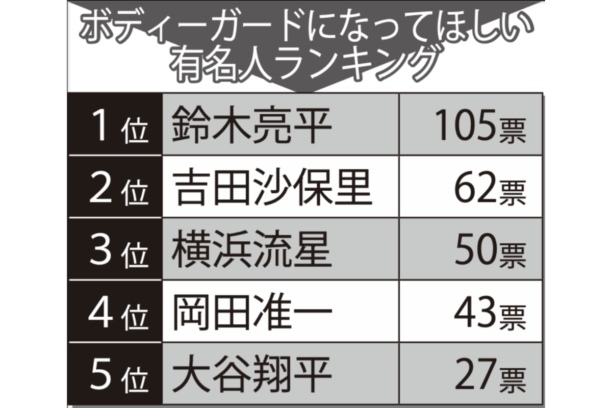 芸能 2025/11/10 《ボディガードになって欲しい有名人》空手の横浜流星、柔術黒帯の岡田准一らを抑えた“カメレオン俳優” 鈴木亮平吉田沙保里岡田准一横浜流星男優大谷翔平女優ランキング 印刷 [写真 1/20枚目] ボディーガードになって欲しい有名人ランキングTOP5 [写真 2/20枚目] 大谷翔平(写真/週刊女性写真班) [写真 3/20枚目] ブラジリアン柔術の黒帯も取得している岡田准一 [写真 4/20枚目] 横浜流星 [写真 5/20枚目] 吉田沙保里 [写真 6/20枚目] 鈴木亮平 [写真 7/20枚目] 遠藤憲一 [写真 8/20枚目] ボディガードになって欲しい有名人TOP5 [写真 9/20枚目] 鈴木亮平演じる“冴羽獠”の相棒を安藤政信、その妹を森田望智が演じている(ネットフリックス公式Xより) [写真 10/20枚目] 鈴木亮平演じる“冴羽獠”が、海パン姿で鍛え上げた肉体を披露するシーンも話題に(ネットフリックス公式Xより) [写真 11/20枚目] 2023年1月、実写映画『シティーハンター』の撮影で東京・新宿に現れた鈴木亮平 [写真 12/20枚目] 武尊と川口葵の結婚披露宴に参加した吉田沙保里(公式インスタグラムより) [写真 13/20枚目] 武尊と川口葵の結婚披露宴に参加した吉田沙保里(公式インスタグラムより) [写真 14/20枚目] 武尊と川口葵の結婚披露宴に参加した狩野舞子ら著名人たち [写真 15/20枚目] 横浜流星も深田恭子の美背中に釘づけ!? [写真 16/20枚目] 横浜流星 撮影/近藤陽介 [写真 17/20枚目] 山田孝之とのツーショットをアップした岡田准一の投稿(本人のXより) [写真 18/20枚目] アサヒビールのCMで共演した生田斗真と岡田准一(アサヒグループ公式チャンネルより) [写真 19/20枚目] アサヒビールのCMで共演した生田斗真と岡田准一(アサヒグループ公式チャンネルより) [写真 20/20枚目] アサヒビールのCMで共演した生田斗真と岡田准一(アサヒグループ公式チャンネルより) この写真の記事へ戻る