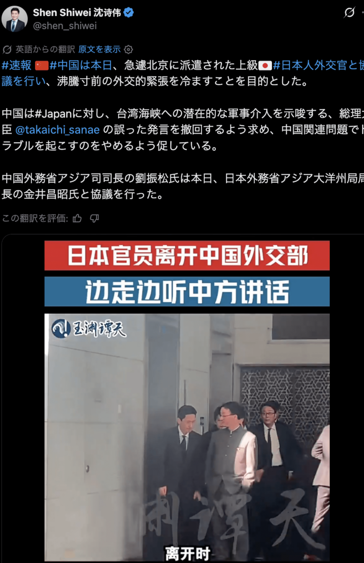 社会・事件 2025/11/20 高市早苗首相の「台湾有事」答弁から緊張続く、中国外交官の“両手ポケットイン”無礼態度も皮肉で受け流す日本のSNS 高市早苗中国・台湾政治家政治政治とカネ中国自民党SNS 印刷 [写真 1/15枚目] 高市早苗総理大臣、就任後初の会見(2025年10月21日) [写真 2/15枚目] ポケットに両手を突っ込んで対応する中国の劉勁松アジア局長(中国のジャーナリストShenShiweiさんのXより) [写真 3/15枚目] ポケットに両手を突っ込んで対応する中国の劉勁松アジア局長(Xより) [写真 4/15枚目] 高市首相への暴言が問題となった中国の薛剣(せつけん)駐大阪総領事のX(本人の公式Xより) [写真 5/15枚目] 高市早苗首相の所信表明時にヤジを飛ばした、立憲・水沼秀幸議員(立憲民主党公式HPより) [写真 6/15枚目] 高市早苗首相に対して好意的なコメントを投稿したチリのガブリエル・ボリッチ大統領(本人のXより) [写真 7/15枚目] チリのガブリエル・ボリッチ大統領の右側から、奥の左肩に手を添えるように軽く身を寄せ、笑顔を向ける高市早苗首相(ボリッチ大統領のXより) [写真 8/15枚目] チリのガブリエル・ボリッチ大統領の右側から、奥の左肩に手を添えるように軽く身を寄せ、笑顔を向ける高市早苗首相(ボリッチ大統領のXより) [写真 9/15枚目] 高市首相を「現地妻」と表現して炎上した元衆議院議員で共産党員の池内さおり氏の投稿(本人のXより) [写真 10/15枚目] 高市首相からの祝電が話題に(拡散されている投稿より) [写真 11/15枚目] SNSで拡散されている、チリ大統領の肩に手をまわす高市首相の切り抜き動画 [写真 12/15枚目] SNSで拡散されている、チリ大統領の肩に手をまわす高市首相の切り抜き動画 [写真 13/15枚目] マーガレット・サッチャーを思わせる、ブルーのスーツとパールを合わせたコーディネートが高市流(本人公式Xより) [写真 14/15枚目] 高市早苗首相を批判した前参院議員の社民党副党首・大椿ゆうこ氏(公式Xより) [写真 15/15枚目] トランプ大統領と握手を交わす高市首相(代表撮影) この写真の記事へ戻る