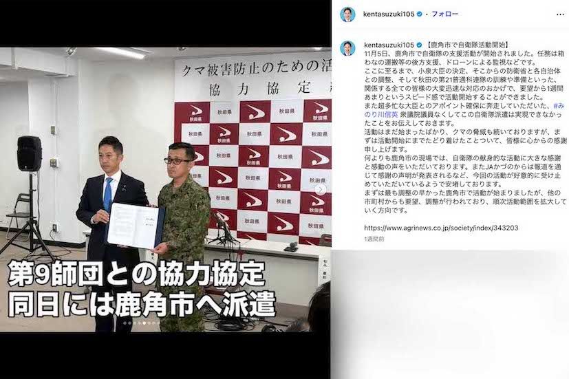 社会・事件 2025/11/24 《秋田県・クマ問題》止まぬ“クレーム電話”は「ほとんど県外から」知事が明かした驚愕の実態に集まる憂慮 動物災害事件政治知事クレーマー 印刷 [写真 1/27枚目] 多発するクマ被害 [写真 2/27枚目] クマ被害を受けて自衛隊の活動開始を報告した秋田県の鈴木健太知事(本人のインスタグラムより) [写真 3/27枚目] 全国各地で出没が続くクマ。それはすでに“東京都内”でも…(写真はイメージです) [写真 4/27枚目] クマ目撃情報も掲載される北海道積丹町(公式HPより) [写真 5/27枚目] 積丹町でのクマトラブルに「最低な副議長」と断じた元宝塚歌劇団の女優・毬谷友子(公式Xより) [写真 6/27枚目] クマ出没注意の看板 [写真 7/27枚目] クマ出没注意の表示 [写真 8/27枚目] 全国で毎年発生しているクマ被害 [写真 9/27枚目] (写真右から)クマ撃退用のスプレーとクマ鈴で自分の命を守る対策を [写真 10/27枚目] 人の生活圏にクマが入らないようにする方法は? [写真 11/27枚目] “かわいすぎる”と話題になったクマ注意喚起チラシ(秋田県ホームページより) [写真 12/27枚目] 自身のYouTubeチャンネルで熊に襲われている一部始終をアップした『原生林の熊』さん(YouTubeチャンネルより) [写真 13/27枚目] 自身のYouTubeチャンネルで熊に襲われている一部始終をアップした『原生林の熊』さん(YouTubeチャンネルより) [写真 14/27枚目] 自身の攻撃をかわしながら熊に反撃している(YouTubeチャンネルより) [写真 15/27枚目] 熊に噛まれた瞬間は痛みを感じなかったというが太ももと腕を負傷(YouTubeチャンネルより) [写真 16/27枚目] 熊に噛まれた瞬間は痛みを感じなかったというが太ももと腕を負傷(YouTubeチャンネルより) [写真 17/27枚目] 熊が現れた国道247号(北海道・占冠村 Googleマップより) [写真 18/27枚目] 声を出して威嚇したが、母熊が突進してきたという(YouTubeチャンネルより) [写真 19/27枚目] クマ被害を受けて自衛隊の活動開始を報告した秋田県の鈴木健太知事(本人のインスタグラムより) [写真 20/27枚目] クマ被害を受けて自衛隊の活動開始を報告した秋田県の鈴木健太知事(本人のインスタグラムより) [写真 21/27枚目] 小泉進次郎防衛相に自衛隊の派遣を要請した秋田県の鈴木健太知事(本人のインスタグラムより) [写真 22/27枚目] 『クマダス』で目撃情報が投稿されている(赤色枠内が秋田市) [写真 23/27枚目] クマ被害の見出しの日本がおかしいNHKニュース [写真 24/27枚目] クマ類の分布(環境省資料より) [写真 25/27枚目] クマ類の分布・生息状況(環境省資料より) [写真 26/27枚目] 秋田県が運用する「クマダス」、赤い「クママーク」に出没情報が(公式HPより) [写真 27/27枚目] 秋田県が運用する、クマ出没の新しい情報共有システム「クマダス」(公式HPより) この写真の記事へ戻る