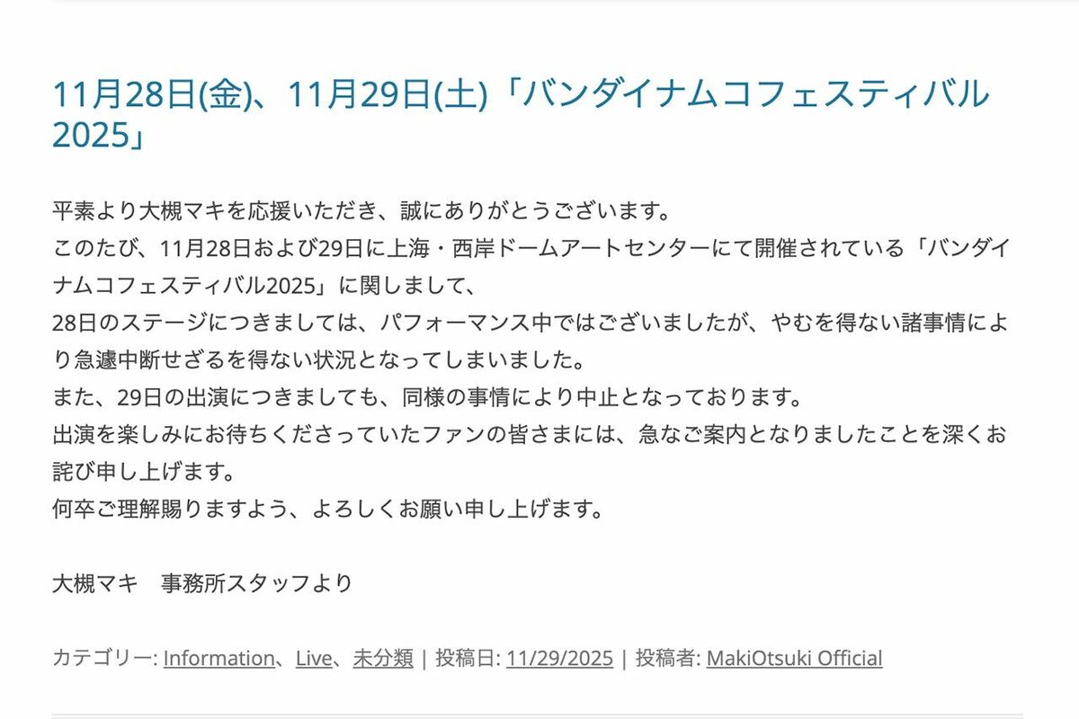 芸能 2025/12/1 『ONE PIECE』主題歌歌手・大槻マキが中国上海イベントで“歌唱中に強制退場”、高市早苗首相の台湾有事発言の影響か 中国高市早苗アーティスト政治海外浜崎あゆみ 印刷 [写真 1/12枚目] 大槻マキ(本人の公式インスタグラムより) [写真 2/12枚目] 中国・上海イベントの中止を報告したももいろクローバーZ(公式HPより) [写真 3/12枚目] 中国・上海イベントで歌唱途中に中断した大槻マキのコメント(公式HPより) [写真 4/12枚目] 高市首相への暴言が問題となった中国の薛剣(せつけん)駐大阪総領事のX(本人の公式Xより) [写真 5/12枚目] ポケットに両手を突っ込んで対応する中国の劉勁松アジア局長(中国のジャーナリストShen Shiwei さんのXより) [写真 6/12枚目] ポケットに両手を突っ込んで対応する中国の劉勁松アジア局長(Xより) [写真 7/12枚目] 高市早苗首相に対して好意的なコメントを投稿したチリのガブリエル・ボリッチ大統領(本人のXより) [写真 8/12枚目] チリのガブリエル・ボリッチ大統領の右側から、奥の左肩に手を添えるように軽く身を寄せ、笑顔を向ける高市早苗首相(ボリッチ大統領のXより) [写真 9/12枚目] チリのガブリエル・ボリッチ大統領の右側から、奥の左肩に手を添えるように軽く身を寄せ、笑顔を向ける高市早苗首相(ボリッチ大統領のXより) [写真 10/12枚目] 高市首相からの祝電が話題に(拡散されている投稿より) [写真 11/12枚目] SNSで拡散されている、チリ大統領の肩に手をまわす高市首相の切り抜き動画 [写真 12/12枚目] SNSで拡散されている、チリ大統領の肩に手をまわす高市首相の切り抜き動画 この写真の記事へ戻る