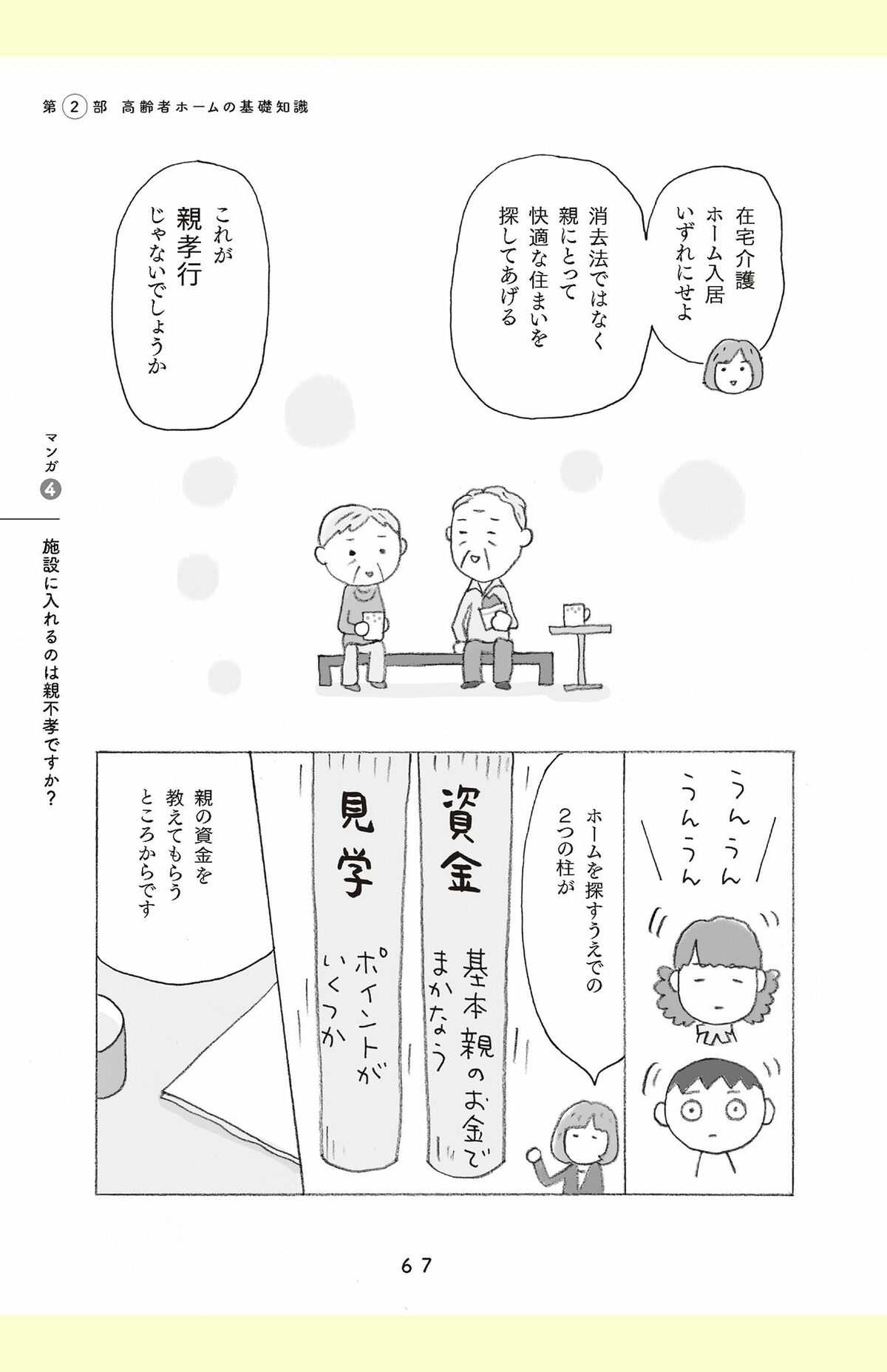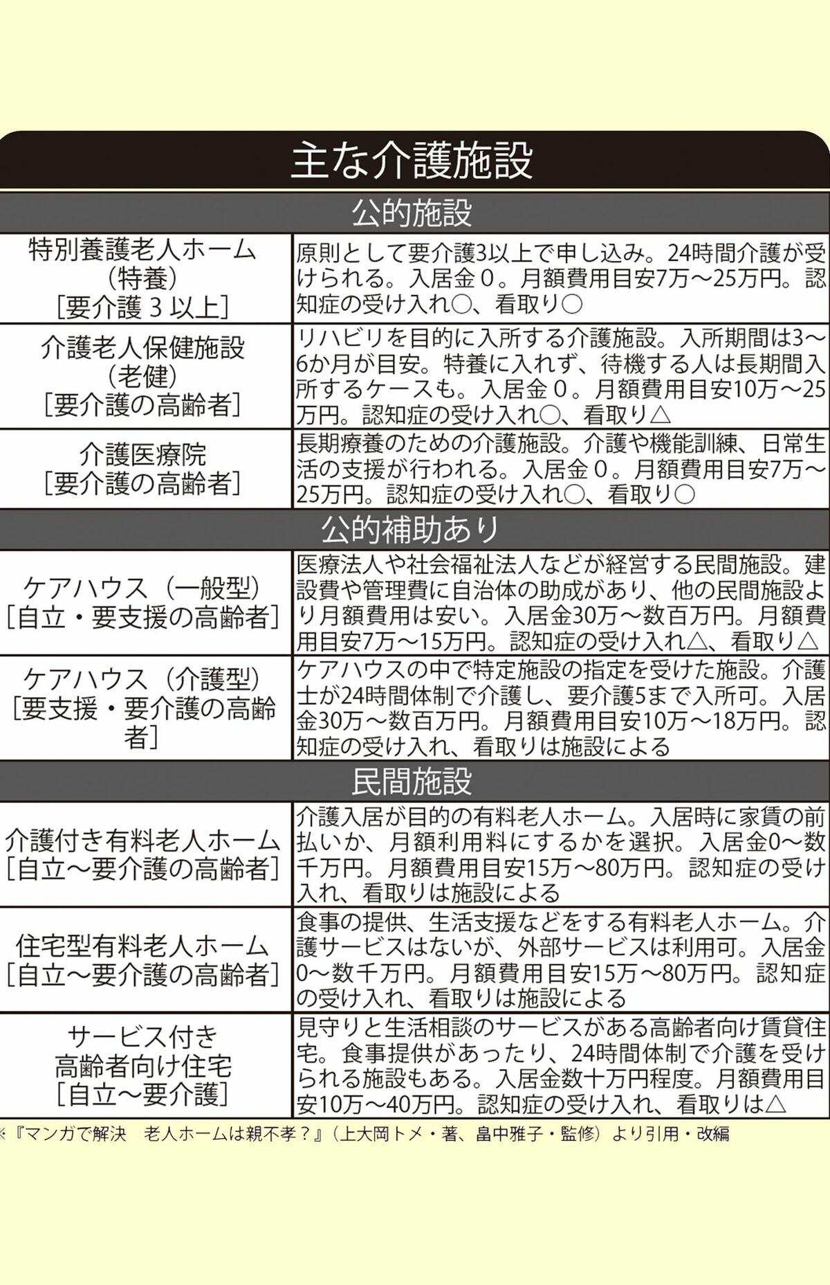 ライフ 2025/12/7 親の介護施設探しは月額利用料は年金内で「お金とタイミング」の正解、介護当事者が語る“リアル” 介護家族老人ホーム高齢者親子年金お金相続親孝行医療 印刷 [写真 1/7枚目] ※写真はイメージです [写真 2/7枚目] 『マンガで解決 老人ホームは親不孝?』より [写真 3/7枚目] 主な介護施設 [写真 4/7枚目] 『マンガで解決 老人ホームは親不孝?』より [写真 5/7枚目] 上大岡さんの著書『マンガで解決 老人ホームは親不孝?』主婦の友社 1760円(税込み)※画像をクリックするとAmazonの商品ページにジャンプします。 [写真 6/7枚目] 上大岡トメさん●イラストレーター。「日々を機嫌よく過ごすこと」を信条に、マンガやイラストで世の中のしくみをわかりやすく解説。著書『キッパリ!たった5分間で自分を変える方法』が130万部のミリオンセラーに。著書多数。 [写真 7/7枚目] 『マンガで解決 老人ホームは親不孝?』より この写真の記事へ戻る