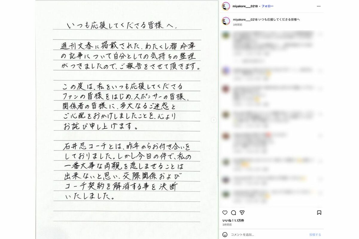 芸能 2025/12/2 女子プロゴルフ・都玲華プロと30歳差の交際も破局宣言した石井忍プロ〈3年前に婚姻関係は破綻〉も投稿していた“夫婦写真” 不倫InstagramスポーツSNS熱愛破局 印刷 [写真 1/35枚目] 女子ゴルファーの都玲華プロ(公式インスタグラムより) [写真 2/35枚目] 都玲華プロと交際も、関係解消に至った石井忍プロ(公式インスタグラムより) [写真 3/35枚目] プロゴルファーの尾崎健夫氏(左)と女優の坂口良子さんのゴルフ大会でのツーショット(2004年) [写真 4/35枚目] プロゴルファーの尾崎健夫氏 [写真 5/35枚目] 2025年正月に放送されたテレビ番組『とんねるずのスポーツ王は俺だ』で俳優の小栗旬にバックハグされる問題の女子ゴルファー [写真 6/35枚目] 日本女子プロゴルフ協会の小林浩美会長(協会の公式HPより) [写真 7/35枚目] ゴルフが趣味な菊間千乃(本人インスタグラムより) [写真 8/35枚目] ゴルフが趣味な菊間千乃(本人インスタグラムより) [写真 9/35枚目] 都内のゴルフ練習場から出てくる内博貴 [写真 10/35枚目] Snow Manの向井康二とゴルフデートが報じられたゴルフYouTuberの『なみき』は、WEST.の桐山照史と結婚した狩野舞子と親交がある(狩野のインスタグラムより) [写真 11/35枚目] Snow Manの向井康二とゴルフデートが報じられたゴルフYouTuberの『なみき』は、WEST.の桐山照史と結婚した狩野舞子と親交がある(なみきのインスタグラムより) [写真 12/35枚目] Snow Manの向井康二とゴルフデートが報じられたゴルフYouTuberの『なみき』(本人のインスタグラムより) [写真 13/35枚目] Snow Manの向井康二とゴルフデートが報じられたゴルフYouTuberの『なみき』(本人のインスタグラムより) [写真 14/35枚目] Snow Manの向井康二とゴルフデートが報じられたゴルフYouTuberの『なみき』(本人のインスタグラムより) [写真 15/35枚目] Snow Manの向井康二とゴルフデートが報じられたゴルフYouTuberの『なみき』(本人のインスタグラムより) [写真 16/35枚目] Snow Manの向井康二とゴルフデートが報じられたゴルフYouTuberの『なみき』(本人のインスタグラムより) [写真 17/35枚目] Snow Manの向井康二とゴルフデートが報じられたゴルフYouTuberの『なみき』(本人のインスタグラムより) [写真 18/35枚目] Snow Manの向井康二とゴルフデートが報じられたゴルフYouTuberの『なみき』(本人のインスタグラムより) [写真 19/35枚目] ゴルフウェアの紗理奈。報道によると既婚者だった男性とは、ゴルフを通じて知り合ったという(本人のSNSより) [写真 20/35枚目] 丈の短いスカートでゴルフを楽しんだことを報告したNHKの中川安奈アナウンサー(本人インスタグラムより) [写真 21/35枚目] 韓国の女子プロゴルファーのアン・シネ(Instagramより) [写真 22/35枚目] 手越祐也と『トータルテンボス』が、女子プロゴルファーの飯島茜氏からレクチャーを受ける(番組公式HPより) [写真 23/35枚目] 全身パステルピンクでひらひらしたゴルフウェアを着る芹那(芹那公式インスタグラムより) [写真 24/35枚目] 6月下旬の平日、江東区のゴルフ場を訪れた森田剛と宮沢りえ夫婦。東京駅から最も近いゴルフ場として知られる [写真 25/35枚目] 都玲華プロが投稿した「破局」報告文(公式インスタグラムより) [写真 26/35枚目] 石井忍コーチの謝罪コメント(本人インスタグラムより) [写真 27/35枚目] オフショットを公開した都玲華プロ(本人インスタグラムより) [写真 28/35枚目] 都玲華プロの謝罪コメント1(本人インスタグラムより) [写真 29/35枚目] 都玲華プロの謝罪コメント2(本人インスタグラムより) [写真 30/35枚目] 30歳年上の既婚者コーチと交際関係にあった都玲華プロ(本人インスタグラムより) [写真 31/35枚目] 30歳年上の既婚者コーチと交際関係にあった都玲華プロ(本人インスタグラムより) [写真 32/35枚目] 「トリプルボギー不倫」を起こした男性キャディー・栗永遼氏の妻で女子プロゴルファーの浅井咲希(本人のインスタグラムより) [写真 33/35枚目] 村田製作所所属の女子プロゴルファー川崎春花(村田製作所ホームページより) [写真 34/35枚目] 女子プロゴルファーの川崎春花(株式会社クロス・ビー ホームページより) [写真 35/35枚目] プロゴルファーの尾崎健夫氏 この写真の記事へ戻る