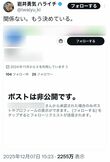 芸能 2025/12/9 ハライチ岩井勇気、着用セーターを中傷されて憤怒…相手はを“鍵垢”にするも「絶対に特定する」と強気宣言 岩井勇気ファッションX炎上野呂佳代お笑い芸人 印刷 [写真 1/12枚目] ハライチの岩井勇気 [写真 2/12枚目] ハライチ・澤部佑 [写真 3/12枚目] 相手が「非公開」にしても執拗に投稿するハライチ岩井勇気(本人のXより)※編集部で画像を一部加工しています [写真 4/12枚目] 騒動の発端となったハライチ岩井勇気の投稿(本人のXより) [写真 5/12枚目] 物議を醸した岩井の不適切発言(Xより) [写真 6/12枚目] ハライチ・岩井勇気と澤部佑(2012年) [写真 7/12枚目] ハライチ・澤部佑 [写真 8/12枚目] ハライチ・澤部佑と岩井勇気 [写真 9/12枚目] ハライチ・澤部佑 [写真 10/12枚目] 子ども乗せ自転車を漕ぐ姿も様になるハライチ澤部 [写真 11/12枚目] モデル、タレント 野呂佳代さん [写真 12/12枚目] 結婚したことを報告する野呂佳代(本人のインスタグラムより) この写真の記事へ戻る