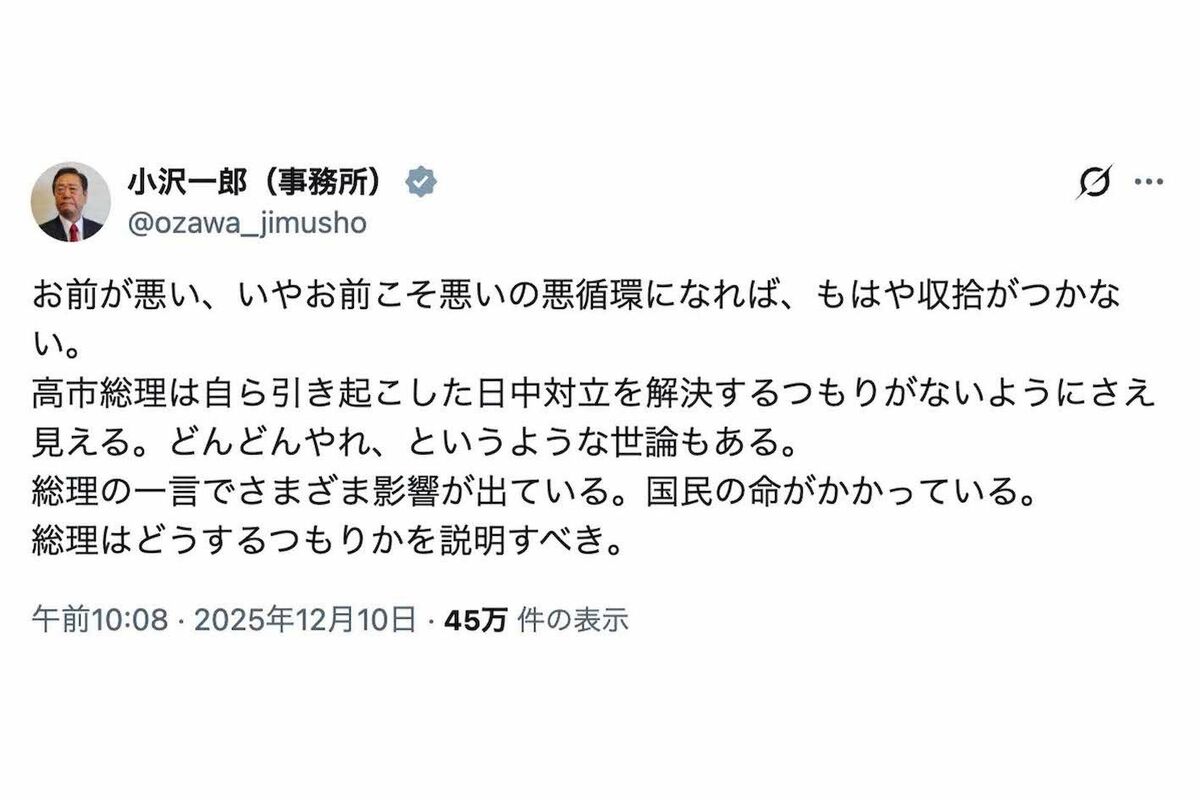 社会・事件 2025/12/12 立憲・小沢一郎氏、日中関係めぐり高市早苗首相への“苦言”投稿も「また外野から批判するだけ」国民呆れ声 高市早苗政治政治家議員野党中国中国・台湾 印刷 [写真 1/37枚目] 立憲民主党の小沢一郎衆院議員 [写真 2/37枚目] 日中問題をめぐる高市早苗首相の態度に苦言を呈した立憲民主党の小沢一郎衆院議員(本人のXより) [写真 3/37枚目] チリのガブリエル・ボリッチ大統領の右側から、奥の左肩に手を添えるように軽く身を寄せ、笑顔を向ける高市早苗首相(ボリッチ大統領のXより) [写真 4/37枚目] チリのガブリエル・ボリッチ大統領の右側から、奥の左肩に手を添えるように軽く身を寄せ、笑顔を向ける高市早苗首相(ボリッチ大統領のXより) [写真 5/37枚目] 高市早苗首相に対して好意的なコメントを投稿したチリのガブリエル・ボリッチ大統領(本人のXより) [写真 6/37枚目] 高市首相からの祝電が話題に(拡散されている投稿より) [写真 7/37枚目] 高市首相からの祝電が話題に(拡散されている投稿より) [写真 8/37枚目] マーガレット・サッチャーを思わせる、ブルーのスーツとパールを合わせたコーディネートが高市流(本人公式Xより) [写真 9/37枚目] エレガントなデザインと上質な素材が特徴のJunAshidaのスーツを高市氏は愛用中(ブランド公式HPより) [写真 10/37枚目] 高市効果で売り切れが続出している濱野皮革工藝の『グレースディライトトート』(公式サイトより) [写真 11/37枚目] SNSで拡散されている日米首脳会談時に乱れたNHK中継映像 [写真 12/37枚目] 阪神タイガースのスマホカバー。画像左、黒色の商品が高市早苗首相の愛用品(楽天市場より) [写真 13/37枚目] 高市早苗首相と握手を交わすトランプ大統領(首相官邸公式HPより) [写真 14/37枚目] 高市早苗首相のモノマネ投稿で賛否となっているキンタロー。(本人のXより) [写真 15/37枚目] 「首相動静」を伝えるアカウント。宿泊先まで報じることに疑問の声も(Xより) [写真 16/37枚目] 再婚後は高市姓を名乗っているという山本拓氏 [写真 17/37枚目] 2025年10月21日、恒例の総理官邸内の階段で写真撮影を行う高市内閣メンバー [写真 18/37枚目] 話題になったグレース ディライトトートを持つ高市首相(首相官邸公式サイトより) [写真 19/37枚目] 高市早苗公式Instagramより [写真 20/37枚目] 高市総理効果で売り切れが続出している濱野皮革工藝のグレース ディライトトート(公式サイトより) [写真 21/37枚目] 高市早苗総理大臣、就任後初の会見(2025年10月21日) [写真 22/37枚目] 高市早苗総理大臣、就任後初の会見(2025年10月21日) [写真 23/37枚目] 高市早苗総理大臣、就任後初の会見(2025年10月21日) [写真 24/37枚目] 高市早苗総理大臣、就任後初の会見(2025年10月21日) [写真 25/37枚目] 高市早苗総理大臣、就任後初の会見(2025年10月21日) [写真 26/37枚目] 高市早苗総理大臣、就任後初の会見(2025年10月21日) [写真 27/37枚目] 高市早苗総理大臣、就任後初の会見(2025年10月21日) [写真 28/37枚目] 10月22日、午前3時29分に投稿された首相官邸の公式X [写真 29/37枚目] 高市首相への暴言が問題となった中国の薛剣(せつけん)駐大阪総領事のX(本人の公式Xより) [写真 30/37枚目] 高市首相を「現地妻」と表現して炎上した元衆議院議員で共産党員の池内さおり氏の投稿(本人のXより) [写真 31/37枚目] 10月30日、高市早苗首相に対する問題発言の“火消し”のような投稿をした東ちづる。《女性だからこそ》と言っていたのに、今度は《女性に限らず》と述べて…(東のXより) [写真 32/37枚目] 高市早苗首相を批判した前参院議員の社民党副党首・大椿ゆうこ氏(公式Xより) [写真 33/37枚目] 高市早苗政権始動からの働きぶり「1か月通信簿」 ※週刊女性編集部がピックアップした項目について、各氏に100点満点で評価してもらった。判定は各項目を足し合わせた総合点から算出した平均値 [写真 34/37枚目] トランプ大統領と高市首相(高市首相本人Xより) [写真 35/37枚目] 体を寄せトランプ大統領と仲睦まじい様子の高市首相(高市首相本人Xより) [写真 36/37枚目] トランプ大統領と握手を交わす高市首相(代表撮影) [写真 37/37枚目] 共同文書に署名する高市総理(右)とアメリカのトランプ大統領(2025年10月28日) この写真の記事へ戻る