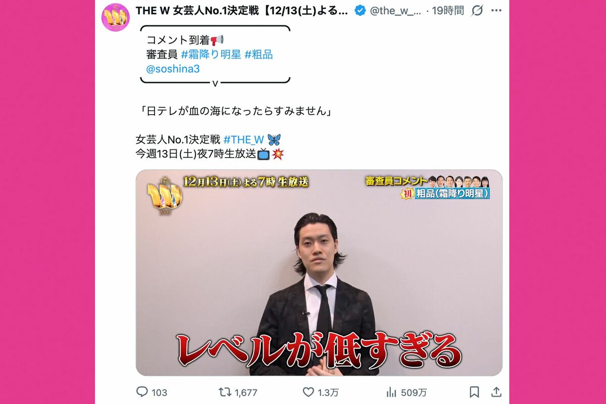 芸能 2025/12/13 『女芸人No.1決定戦THE W 』「おもんない」発言の粗品の辛口審査に期待する声が続々、決勝進出者に業界から熱視線 粗品女芸人日本テレビお笑い芸人M-1グランプリフジテレビゆりやんレトリィバァ 印刷 [写真 1/11枚目] 粗品 [写真 2/11枚目] 大会に対して辛辣な意見を述べる粗品(『THEW女芸人No.1決定戦』公式Xより) [写真 3/11枚目] 大会に対して辛辣な意見を述べる粗品(『THEW女芸人No.1決定戦』公式Xより) [写真 4/11枚目] 大会に対して辛辣な意見を述べる粗品(『THEW女芸人No.1決定戦』公式Xより) [写真 5/11枚目] フレッシュな顔ぶれが揃った『THEW女芸人No.1決定戦』(公式サイトより) [写真 6/11枚目] ゲームセンターで居残り練習をする粗品 [写真 7/11枚目] 結婚式を挙げたことをインスタグラムで報告する粗品の元妻・Aさん [写真 8/11枚目] 結婚式を挙げたことをインスタグラムで報告する粗品の元妻・Aさん [写真 9/11枚目] 結婚式を挙げたことをインスタグラムで報告する粗品の元妻・Aさん [写真 10/11枚目] 撮影中は演技で圧倒するも、帰る直前まで仲間を笑わせていたゆりやんレトリィバァ(2022年) [写真 11/11枚目] 自身のインスタグラムにてイメチェン姿を披露した、3時のヒロイン・ゆめっち この写真の記事へ戻る