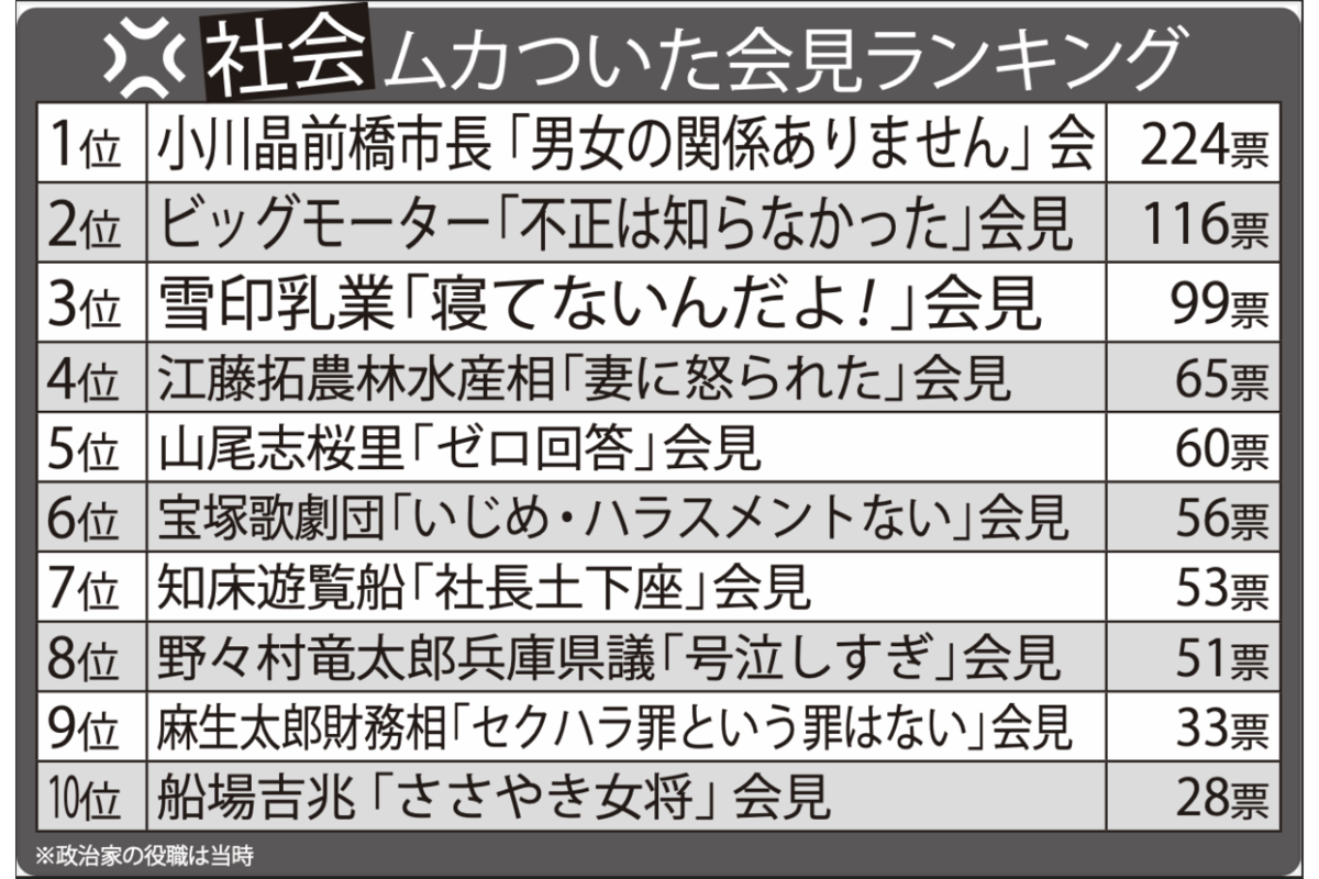 社会・事件 2025/12/22 《社会・政治編》平成&令和の「ムカついた」会見TOP10!ビッグモーター超えの1位は“苦しすぎる”釈明に「絶対に嘘」 記者会見事件ランキング不倫麻生太郎 印刷 [写真 1/19枚目] 見ていてムカついた社会記者会見ランキングTOP10 [写真 2/19枚目] 2007年、船場吉兆おかみ [写真 3/19枚目] 麻生太郎氏 [写真 4/19枚目] 取材から全力逃走する野々村竜太郎(4/6) [写真 5/19枚目] 知床半島沖の観光船遭難事故の記者会見で、土下座して謝罪する「知床遊覧船」の桂田精一社長(共同通信) [写真 6/19枚目] 宝塚歌劇団が公演を行う東京宝塚劇場 [写真 7/19枚目] 山尾志桜里氏 [写真 8/19枚目] 記者から進退を問われ、怪訝な表情を浮かべる江藤拓農水大臣(YouTube『ANNnewsCH』より) [写真 9/19枚目] ビッグモーターの兼重宏行前社長 [写真 10/19枚目] 小川晶前橋市長(本人のYouTubeより) [写真 11/19枚目] 社会ムカついたランキングTOP10 [写真 12/19枚目] 2025年「衝撃の芸能ニュース」ランキング [写真 13/19枚目] 「終わってもいい」長寿番組ランキング [写真 14/19枚目] 女性1000人に聞いた「予想外のおしどり夫婦」ランキング [写真 15/19枚目] 2025年ニュースな有名人失言ランキングTOP10 [写真 16/19枚目] 「紅白にこの人が出れば見る」白組ランキングTOP5 [写真 17/19枚目] 「紅白にこの人が出れば見る」紅組ランキングTOP5 [写真 18/19枚目] 木村拓哉の「ハマり役」ランキング ※インターネットアンケートサイト「Freeasy」にて9月中旬、全国の40歳以上70歳以下の男女500人を対象に選択方式で実施 [写真 19/19枚目] 2025年クリスマスディナーショーお値段ランキング この写真の記事へ戻る