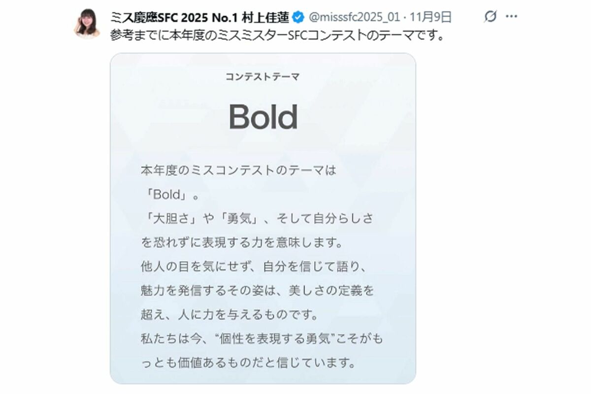 芸能 2025/12/18 ミス東大の貧困学生を嘲笑した発言や総額1000万円私服の投稿が物議…「いっさい関係ない」大学側は“我関せず”の対応 ミスコン大学SNSX炎上 印刷 [写真 1/36枚目] 東京大学 [写真 2/36枚目] 総額1000万円を超える私服を公開した須賀ありささん(本人インスタグラムより) [写真 3/36枚目] 物議を醸した村上佳蓮さんの投稿(本人Xより) [写真 4/36枚目] 村上佳蓮さんが投稿したミスミスターSFCコンテストのコンセプト(本人Xより) [写真 5/36枚目] 今年のミスミスターSFCコンテストに出場する村上佳蓮さん(『MISCOLLE』公式サイトより) [写真 6/36枚目] 2025年度の上智大学コンテスト(公式インスタグラムより) [写真 7/36枚目] 2025年度の上智大学コンテストグランプリと準グランプリ(公式インスタグラムより) [写真 8/36枚目] 2024年度の上智大学コンテスト(公式インスタグラムより) [写真 9/36枚目] 2025年度青山学院大学のミスコンファイナリスト(『MISCOLLE』公式サイトより) [写真 10/36枚目] 今年のミスミスターSFCコンテスト出場者(『MISCOLLE』公式サイトより) [写真 11/36枚目] グランプリが決定した立教大学のミスコン(公式Xより) [写真 12/36枚目] 『MISCOLLE』はさまざまな大学のコンテスト情報を掲載(『MISCOLLE』ホームページより) [写真 13/36枚目] Xのプロフィール欄にも“ミス京大2024グランプリ”の記載が(『一条美輝』Xより) [写真 14/36枚目] 京大医学部の1年生はミス京大グランプリを獲得したとしている(『一条美輝』Xより) [写真 15/36枚目] 『MISCOLLE』に掲載されている“京大ミスコンテスト2024”(『MISCOLLE』ホームページより) [写真 16/36枚目] 投票期間は約2日間(『MISCOLLE』ホームページより) [写真 17/36枚目] 『東京都立大学ミスミスターコンテスト2024』エントリーナンバー2番、福光百花さん(本人のXより) [写真 18/36枚目] 《毎日投票してくださる方、応援メッセージ送ってくださる方は年齢関係なく嬉しいです》とも投稿した福光百花さん(本人のXより) [写真 19/36枚目] 「親と同じくらいの歳の男性でも好きなら恋愛対象に入りますか?」という質問に《炎上覚悟で答えますが入りません》と回答した福光百花さん(本人のXより) [写真 20/36枚目] 年の差恋愛について《あくまで私は対象外ってだけです。別に一般化しているわけではない》と述べた福光百花さん(本人のXより) [写真 21/36枚目] 《お怒りのオヂ様》に向けて意見を発信した福光百花さん(本人のXより) [写真 22/36枚目] 炎上を受け、《誤解を生み申し訳ありません》と投稿した福光百花さん(本人のXより) [写真 23/36枚目] 大学のミスコンに出ていたころの『都内某所』リチ [写真 24/36枚目] ミスコンに出場していたころのリチ(ミスキャンパスHPより) [写真 25/36枚目] ミスコンに出場していたころのリチ(ミスキャンパスHPより) [写真 26/36枚目] 大学1年生のころ、日本一の新入生を決めるミスコンに出場していた熊井ひとみ容疑者(現在は削除済み) [写真 27/36枚目] 大学1年生のころ、日本一の新入生を決めるミスコンにし出場していた熊井ひとみ容疑者(現在は削除済) [写真 28/36枚目] 学歴ツイートの元祖であるミス慶応竹内えりかさんの投稿(本人Twitterより) [写真 29/36枚目] 腕時計はロレックスのデイトナと見られている(須賀ありささんインスタグラムより) [写真 30/36枚目] 須賀ありささんのグランプリ受賞に異議が唱えられた(拡散されている投稿より) [写真 31/36枚目] 須賀ありささんのグランプリ受賞に異議が唱えられた(拡散されている投稿より) [写真 32/36枚目] 東大ミスコンでグランプリを受賞した須賀ありささん(ミスコレより) [写真 33/36枚目] 2025年3月に慶應義塾大学法学部を卒業した須賀ありささん(本人Xより) [写真 34/36枚目] 慶應義塾女子高等学校に通っていた須賀ありささん(本人Xより) [写真 35/36枚目] 最高学府・東京大学 [写真 36/36枚目] 東京大学の施策ははたして効果があるのだろうか この写真の記事へ戻る