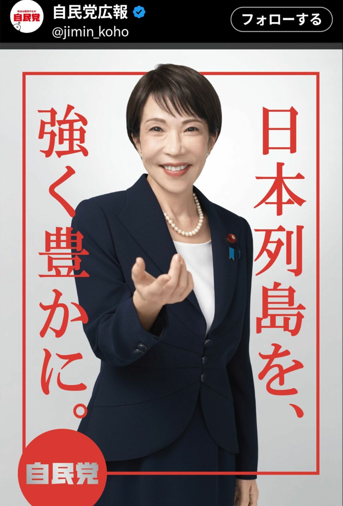 社会・事件 2025/12/19 れいわ新選組の西郷みなこ政策委員、自民党の“政治活動ポスター”の「日本列島」という文言を批判して逆にツッコミ殺到 高市早苗自民党政治政治家X炎上 印刷 [写真 1/15枚目] れいわ新選組の西郷みなこ政策委員(同党の公式HPより) [写真 2/15枚目] ポロシャツパツパツの山本太郎 [写真 3/15枚目] 山本太郎 [写真 4/15枚目] '20年6月下旬、都知事選に向け街頭演説を行う山本太郎 [写真 5/15枚目] '20年6月下旬、都知事選に向け街頭演説を行う山本太郎 [写真 6/15枚目] 高市早苗首相が大きく写った自民党の新しいポスター(自民党広報の公式Xより) [写真 7/15枚目] 高市早苗首相が大きく写った自民党の新しいポスター(自民党広報の公式Xより) [写真 8/15枚目] 体を寄せトランプ大統領と仲睦まじい様子の高市首相(高市首相本人Xより) [写真 9/15枚目] 共同文書に署名する高市総理(右)とアメリカのトランプ大統領(2025年10月28日) [写真 10/15枚目] 高市早苗首相と握手を交わすトランプ大統領(首相官邸公式HPより) [写真 11/15枚目] 2025年10月21日、恒例の総理官邸内の階段で写真撮影を行う高市内閣メンバー [写真 12/15枚目] れいわ新選組の八幡愛議員(公式サイトより) [写真 13/15枚目] aespaの「Whiplash」を踊るれいわ新選組の奥田ふみよ議員(本人のTikTokより) [写真 14/15枚目] れいわ新選組の奥田ふみよ参議院議員(同党の公式HPより) [写真 15/15枚目] 『れいわ新選組』山本太郎 この写真の記事へ戻る
